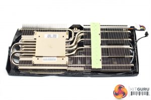 The GPU contacts with a nickel-plated copper base, and this uses ASUS’ MaxContact technology which essentially makes the surface a lot flatter than traditional heat spreaders – up to 10 times flatter according to ASUS. This simply ensures increased contact between the GPU die and the plate, thus enabling greater heat transfer.