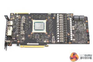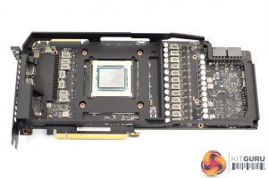 Only 6 screws need to be removed from the back of the card to prise off the heatsink, and that reveals the PCB. You will notice there is still a metal frame screwed into the backplate, however, and this provides extra structural support to the card – to prevent any sagging – while it also acts as a heatsink for the VRAM chips.