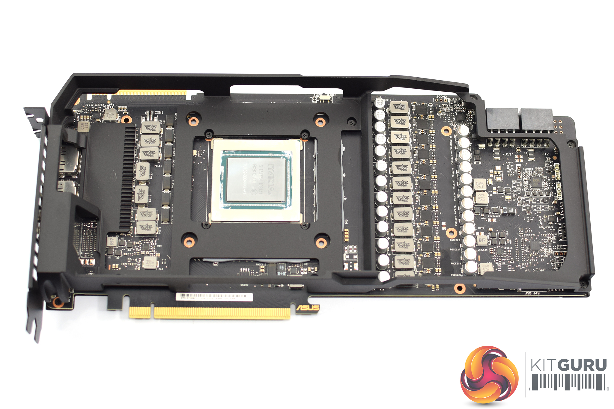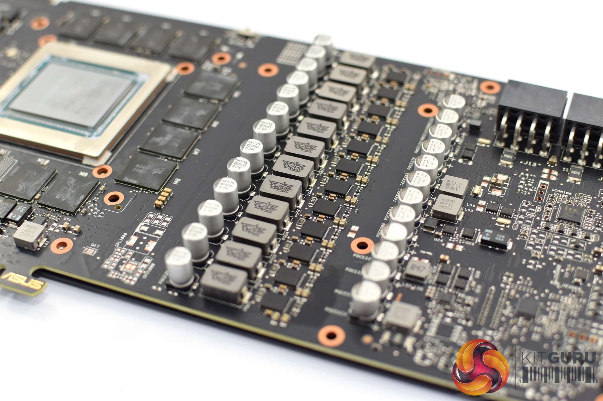 Removing that frame gives us a clear look at the custom PCB, and it is certainly a piece of work. Where Nvidia's Founders Edition 2080 Ti uses 13+3 power phases, ASUS has upped this to 16+3 with its Super Alloy Power (SAP) II design. As part of its SAP II design, it also reckons its capacitors offer over 90,000 hours longer lifespan than traditional capacitors, although we would have to be here for a very long time to actually verify that!