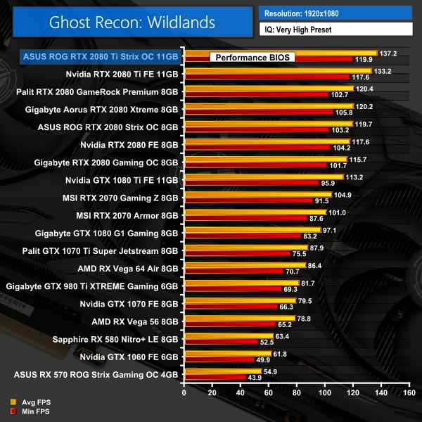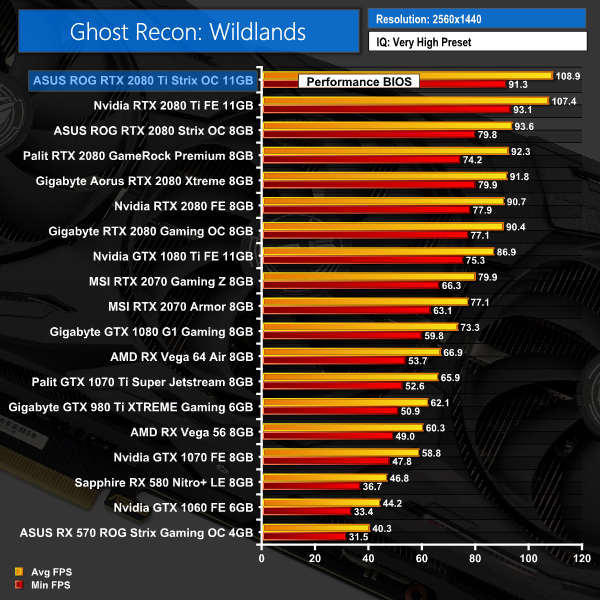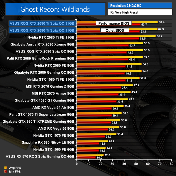 The margins are a bit smaller with Ghost Recon: Wildlands, but again – the Strix card takes top spot at 1080p, 1440p and 4K resolutions.