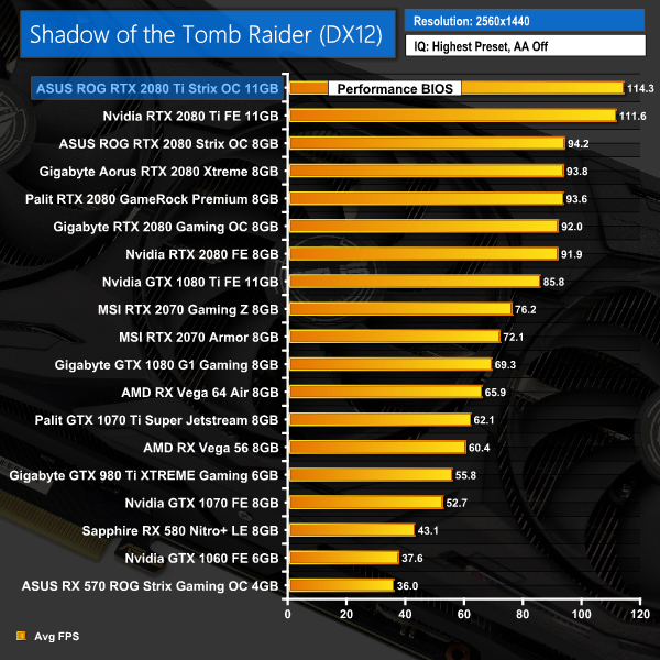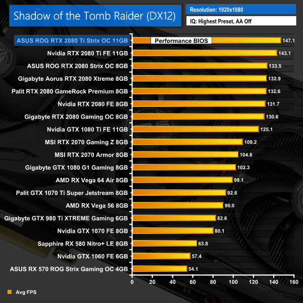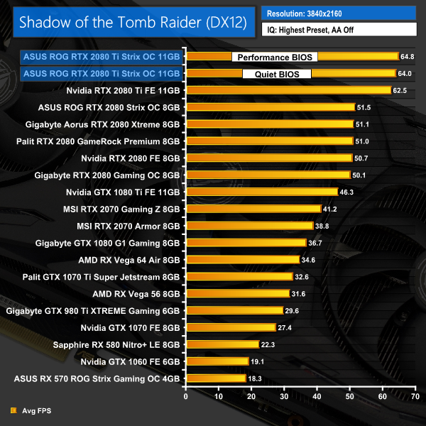 Last of all, we come to Shadow of the Tomb Raider. The Strix 2080 Ti again takes the lead across the board here, with gains of 2-3FPS when compared to the Founders 2080 Ti.