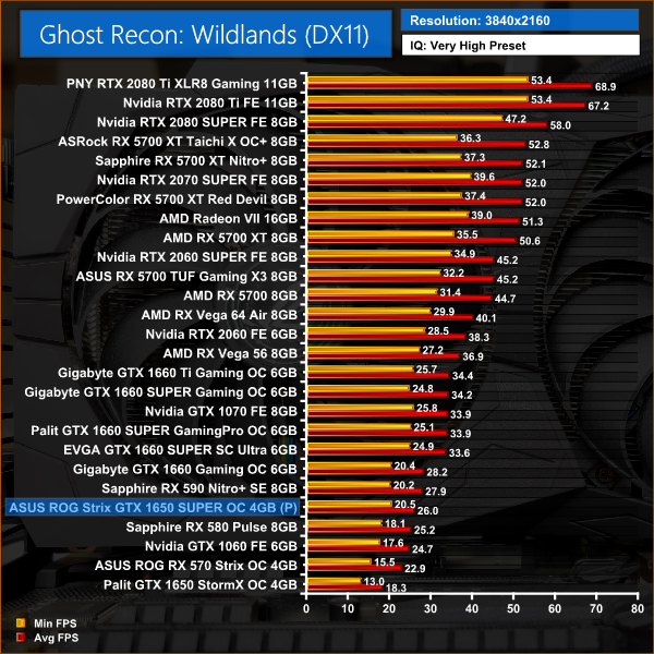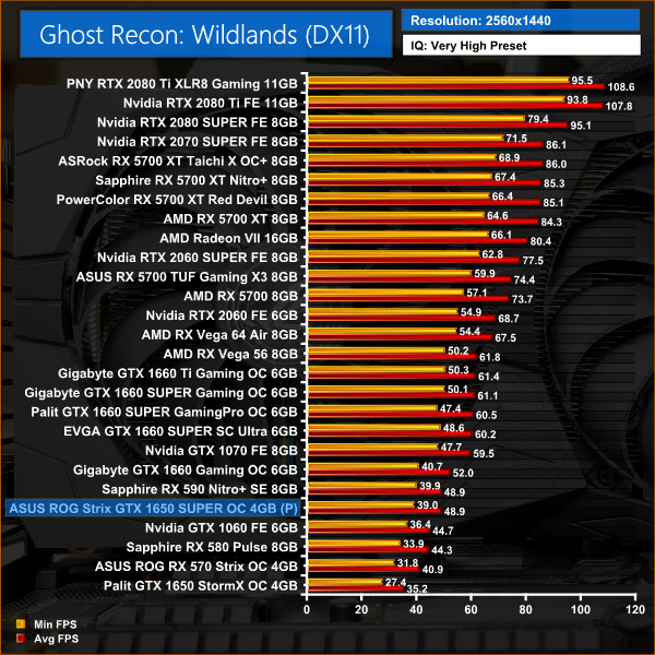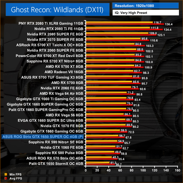 Wildlands is typically more favourable to Nvidia cards, and as such we see a 13% performance increase for the 1650 SUPER versus RX 580 – one of the biggest difference across all of our games.