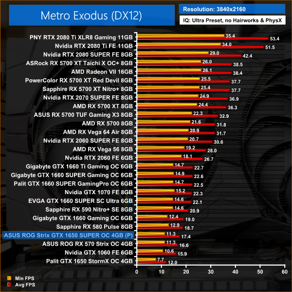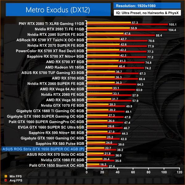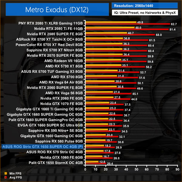 Metro Exodus is a really punishing benchmark, and here the 1650 SUPER just slips behind the RX 580, with a 4% performance deficit at 1080p. It is also 11% slower than the 1660 here.