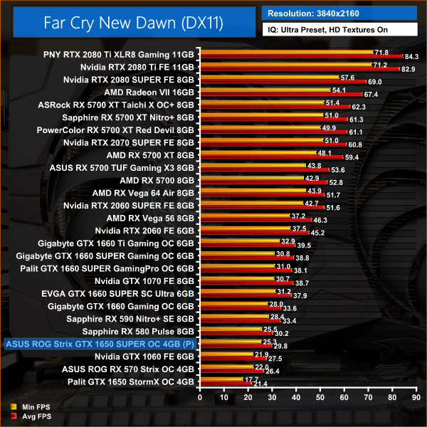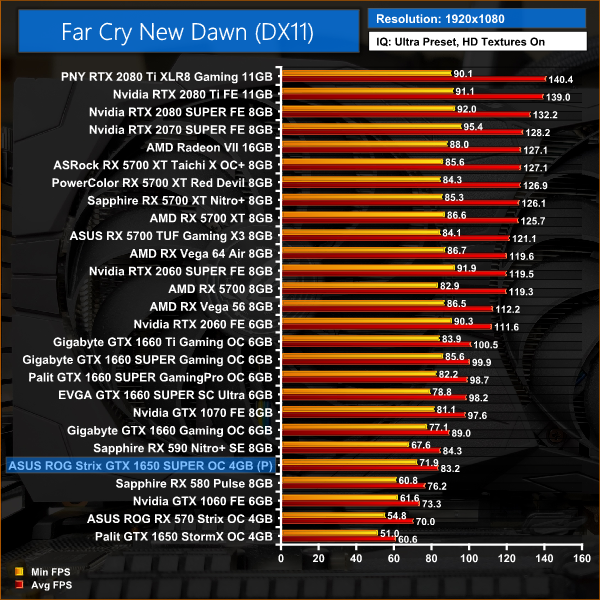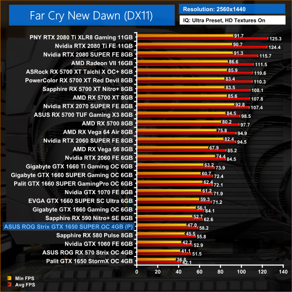 Far Cry New Dawn again puts the 1650 SUPER on par with RX 590 at 1080p, giving it a 9% lead over RX 580. Similarly, the Strix is only 7% behind GTX 1660 at the same resolution.