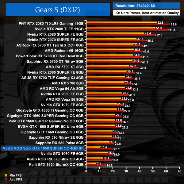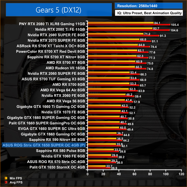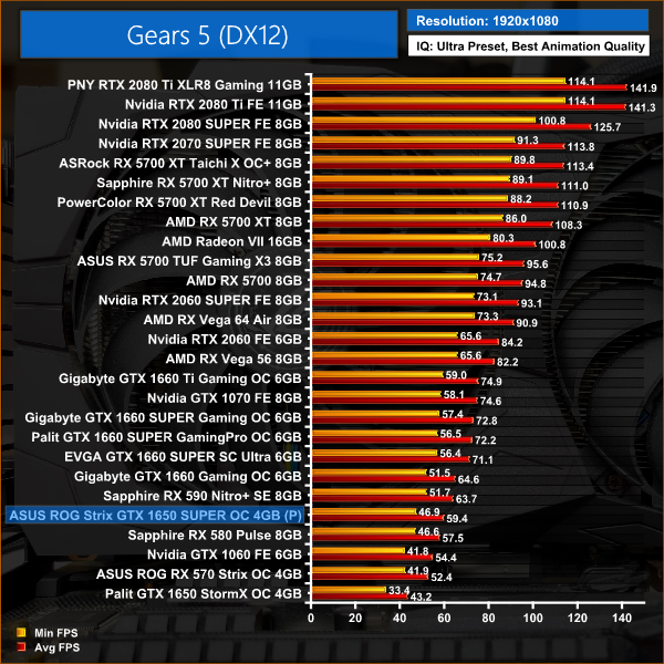 In Gears 5, 1650 SUPER is just 3% faster than RX 580 at 1080p, and 8% behind GTX 1660. Average frame rate is just under the 60FPS mark.
