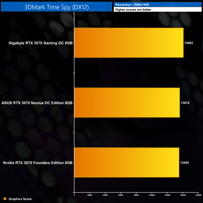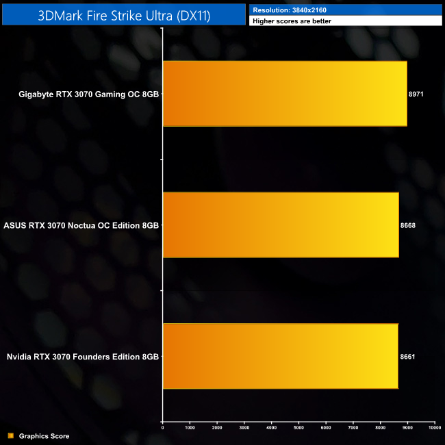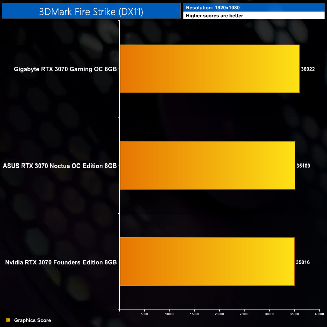 Kicking off with our 3DMark benchmarks, there's not much to split between all three RTX 3070s. The Gigabyte Gaming OC does top the chart in every benchmark, but the differences are marginal.