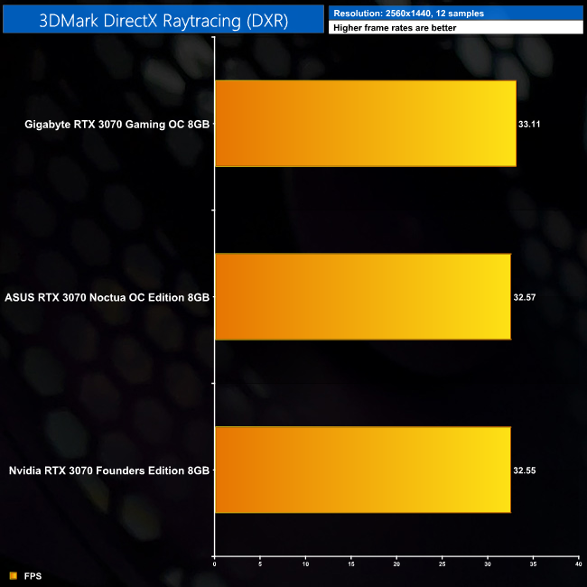 Likewise, for the 3DMark DXR featuretest, there's less than single frame between all three cards tested.