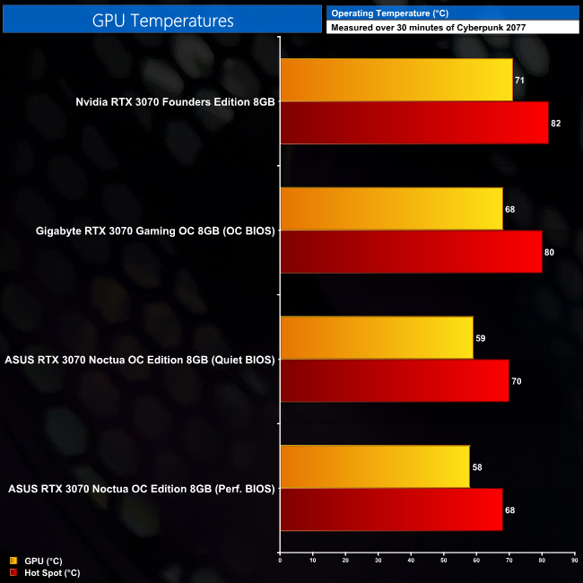 As for our thermal testing, this is where things get really interesting. We have of course tested both the Performance and the Quiet BIOS, but really there’s not much between them – both delivered peak temperatures under 60C, with the hot spot running 10-12C warmer. As we’d hope, that means this Noctua cooler wipes the floor with the other two RTX 3070s we’ve tested, with the ASUS performance BIOS delivering a peak GPU temperature that is 13C lower than Nvidia’s Founders Edition.