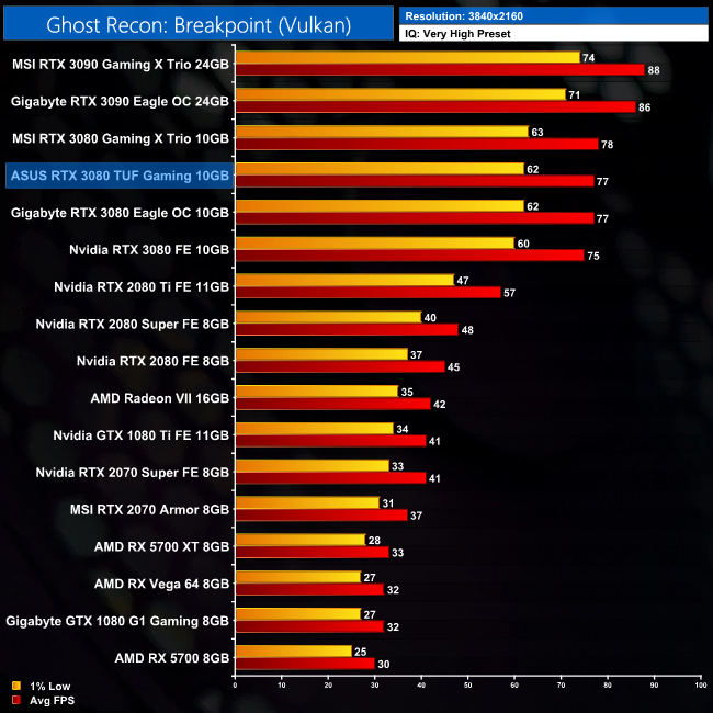 Ghost Recon: Breakpoint sees the TUF do a little better, relatively speaking, as it averages 77FPS at 4K. This is the same result as the Gigabyte RTX 3080 Eagle OC, putting both cards 3% ahead of the Founders Edition.