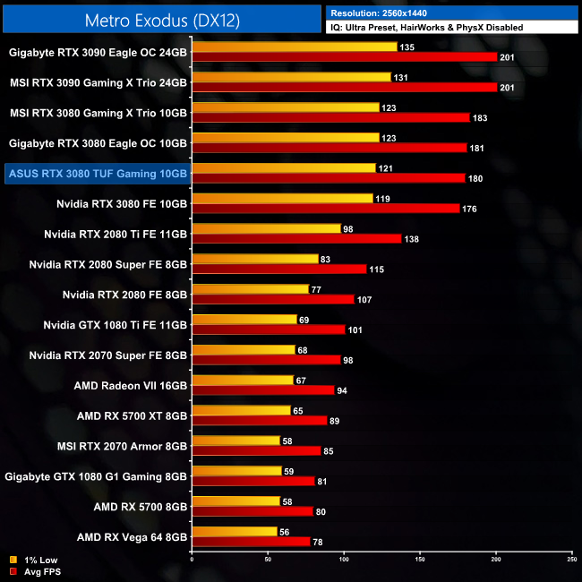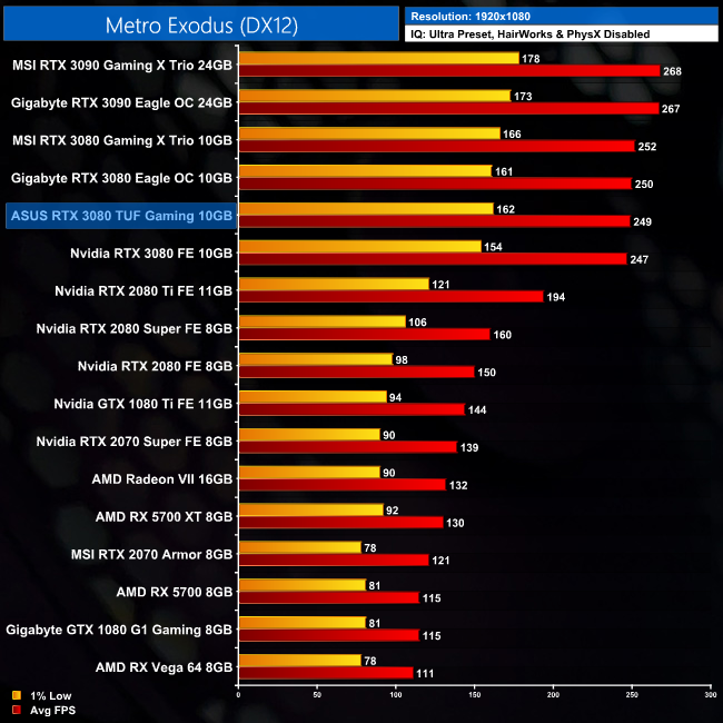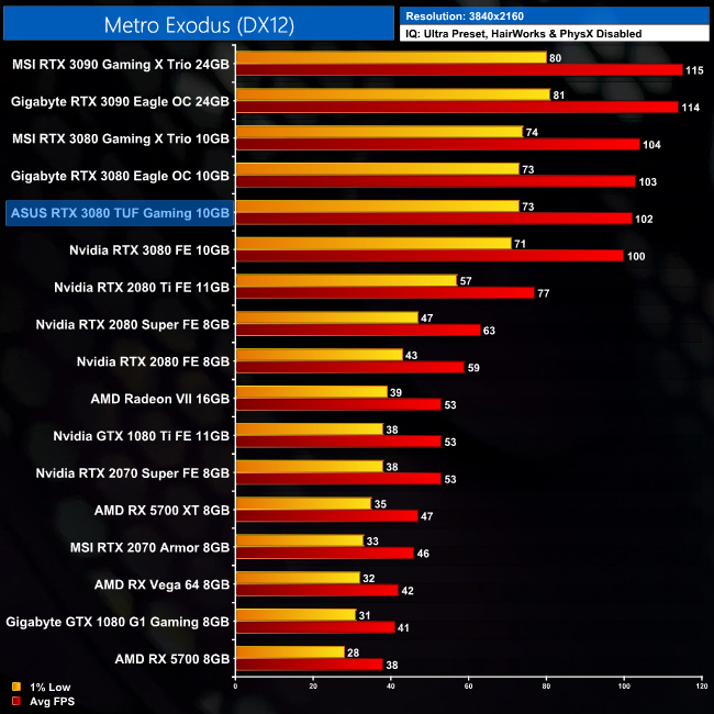 In Metro Exodus, all of the RTX 3080 card we have tested are able to average at least 100FPS at 4K, which isn't bad going at all. The TUF Gaming averages 102FPS, making it 2% faster than the Founders Edition, and 32% faster than the RTX 2080 Ti.