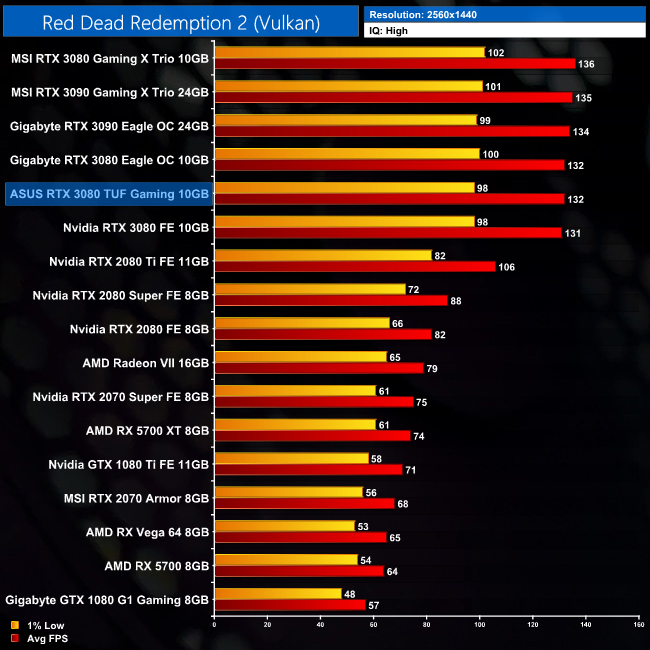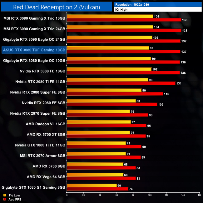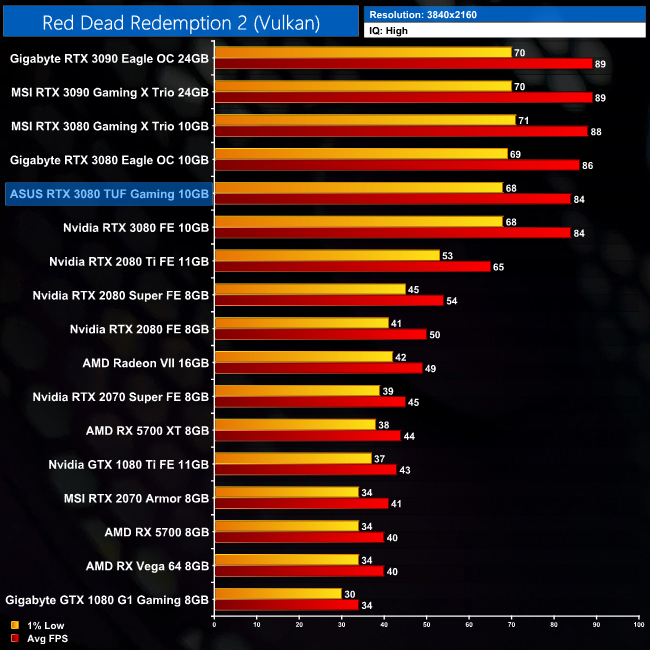 Things tighten up further in Red Dead Redemption 2. Once more, we are seeing no difference in average frame rate between the RTX 3080 Founders Edition and the TUF Gaming model at 4K.
