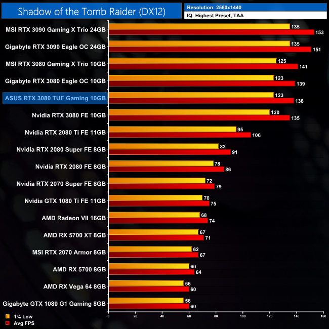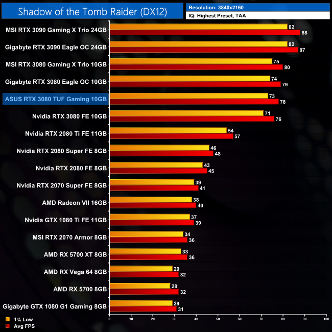 As for Shadow of the Tomb Raider, at 4K we see a 3% lead for the TUF Gaming compared to the 3080 Founders Edition, a difference of just 2FPS. The TUF is 37% faster than RTX 2080 Ti at this resolution.