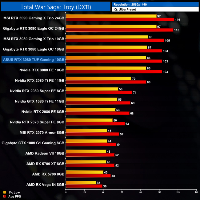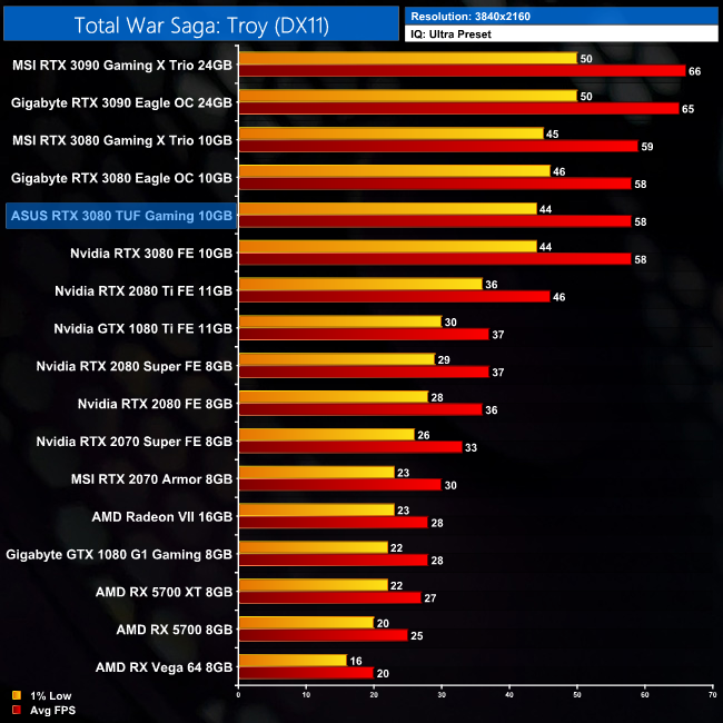 Finally we come to Total War Saga: Troy. Once more, we see no difference between the TUF Gaming and RTX 3080 Founders Edition at 4K. In fact, that is also the case for the RTX 3080 Eagle OC, while MSI's Gaming X Trio is just a single frame faster.
