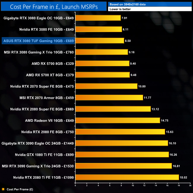 Stock and pricing issues aside, using the given MSRP of £689 for the TUF Gaming, we can see cost per frame works out at £8.50. This is fractionally higher than the Founders Edition and Gigabyte RTX 3080 Eagle OC, but still ahead of every other GPU on the chart.