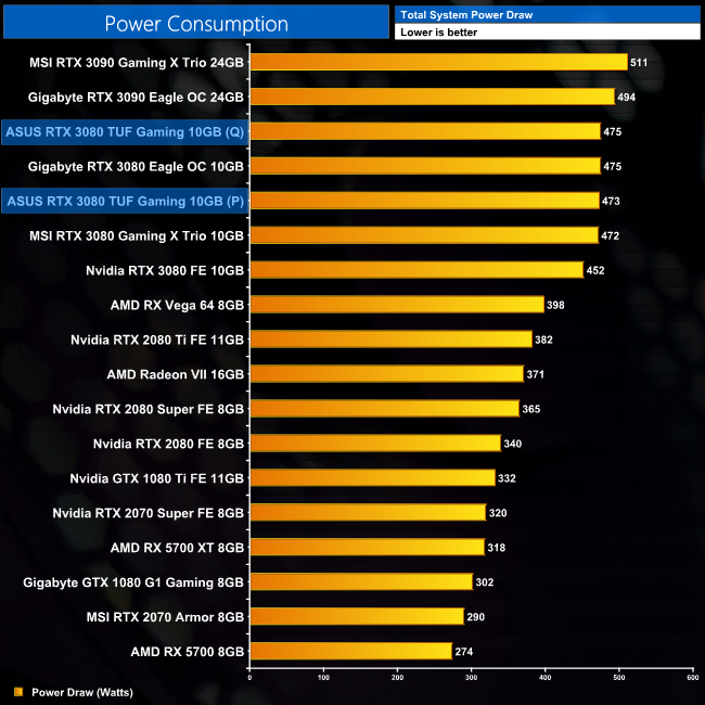 Total system power draw is inline with the other custom RTX 3080s we have tested, with both BIOS pulling around 475W at the wall.