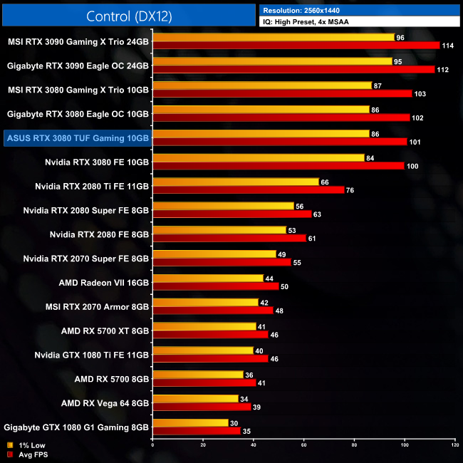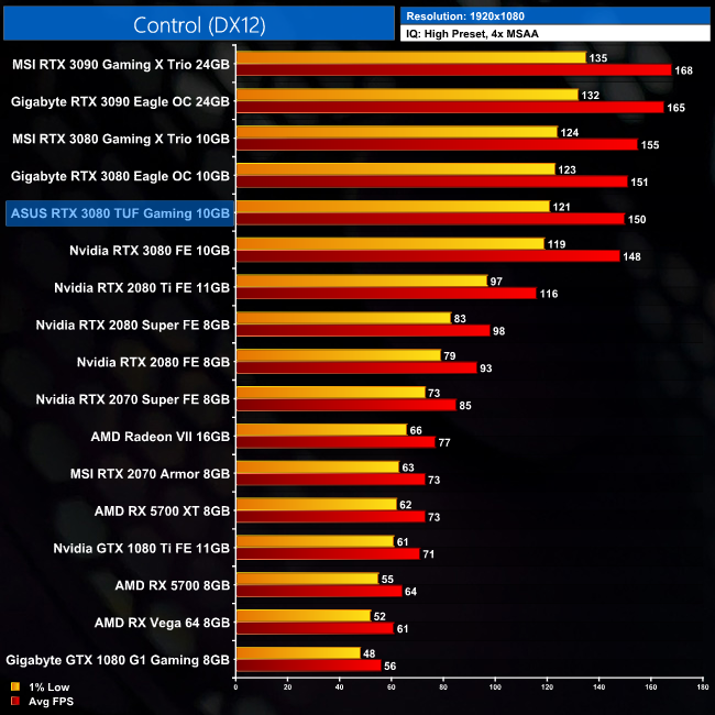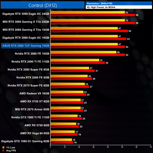 In Control, at 4K we can see the ASUS TUF Gaming RTX 3080 exactly matching the Founders Edition, hitting 52FPS on average. This means the TUF is 37% faster than the RTX 2080 Ti, but 4% slower than the MSI RTX 3080 Gaming X Trio.