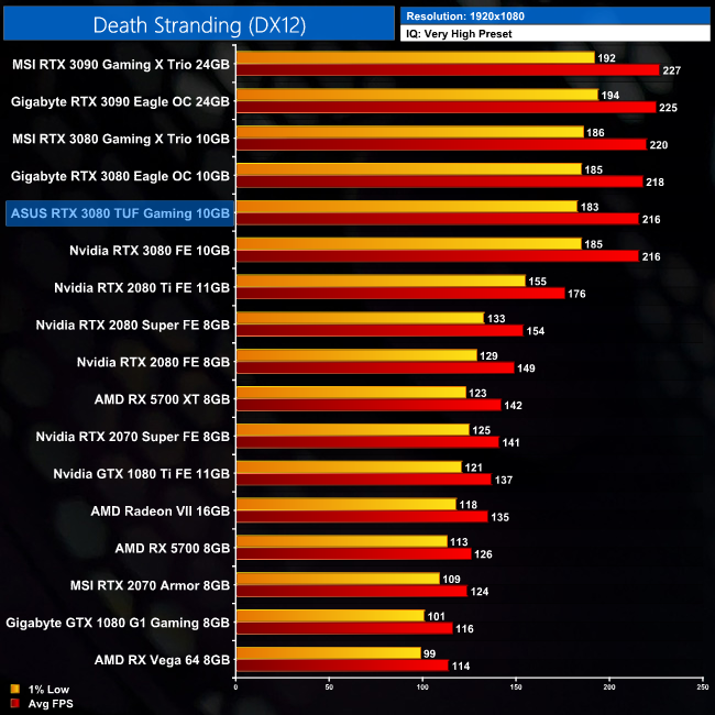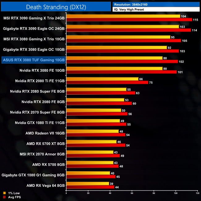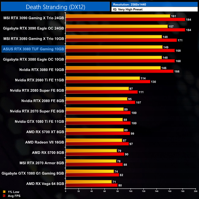 In Death Stranding, the TUF Gaming takes a slim lead over the Founders Edition, with an advantage of just 2FPS at 1440p, and a single frame at 4K.