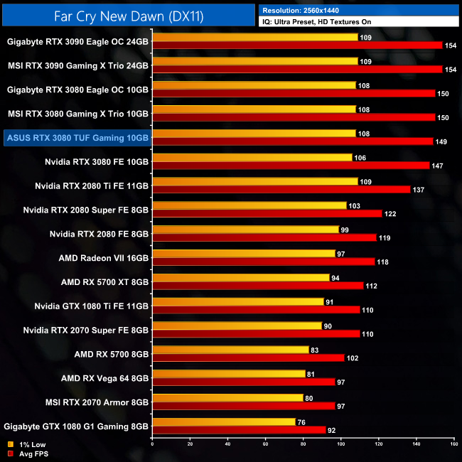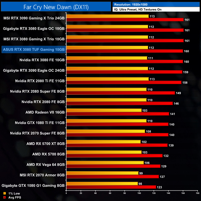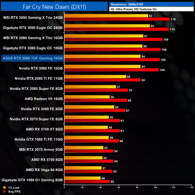 Far Cry New Dawn is heavily CPU bottlenecked at 1080p, and even at 1440p to a lesser extent. At 4K, the TUF Gaming RTX 3080 takes a 25% lead over the RTX 2080 Ti, while it is a single frame faster than the Founders Edition.