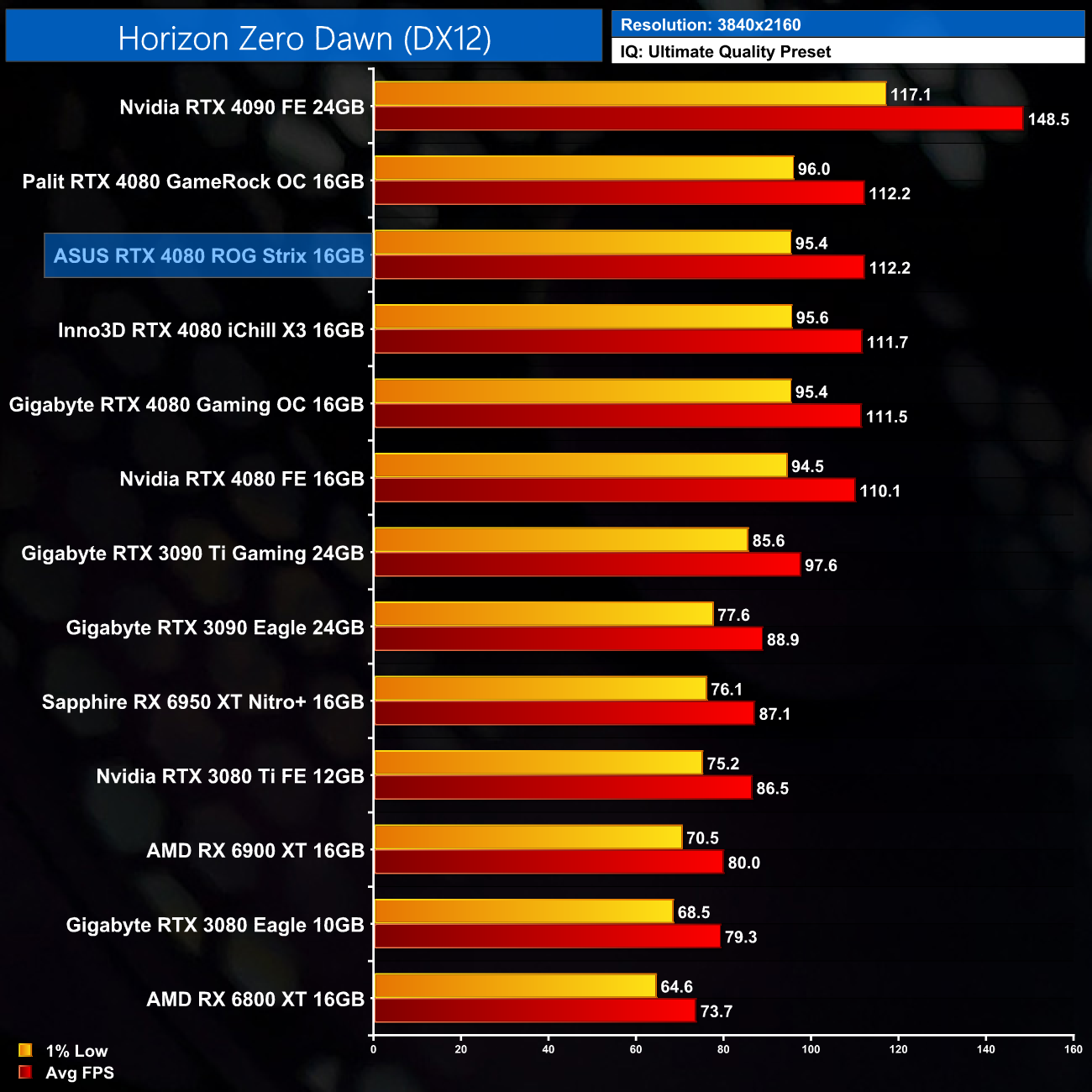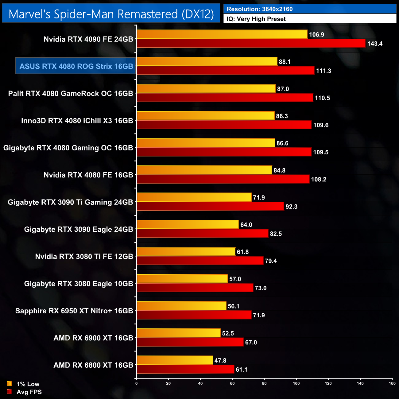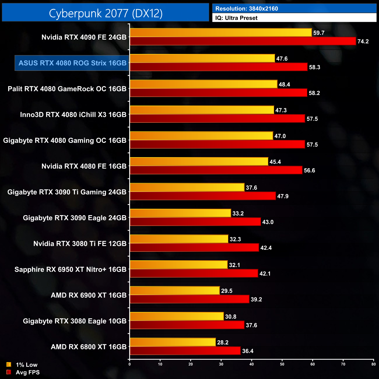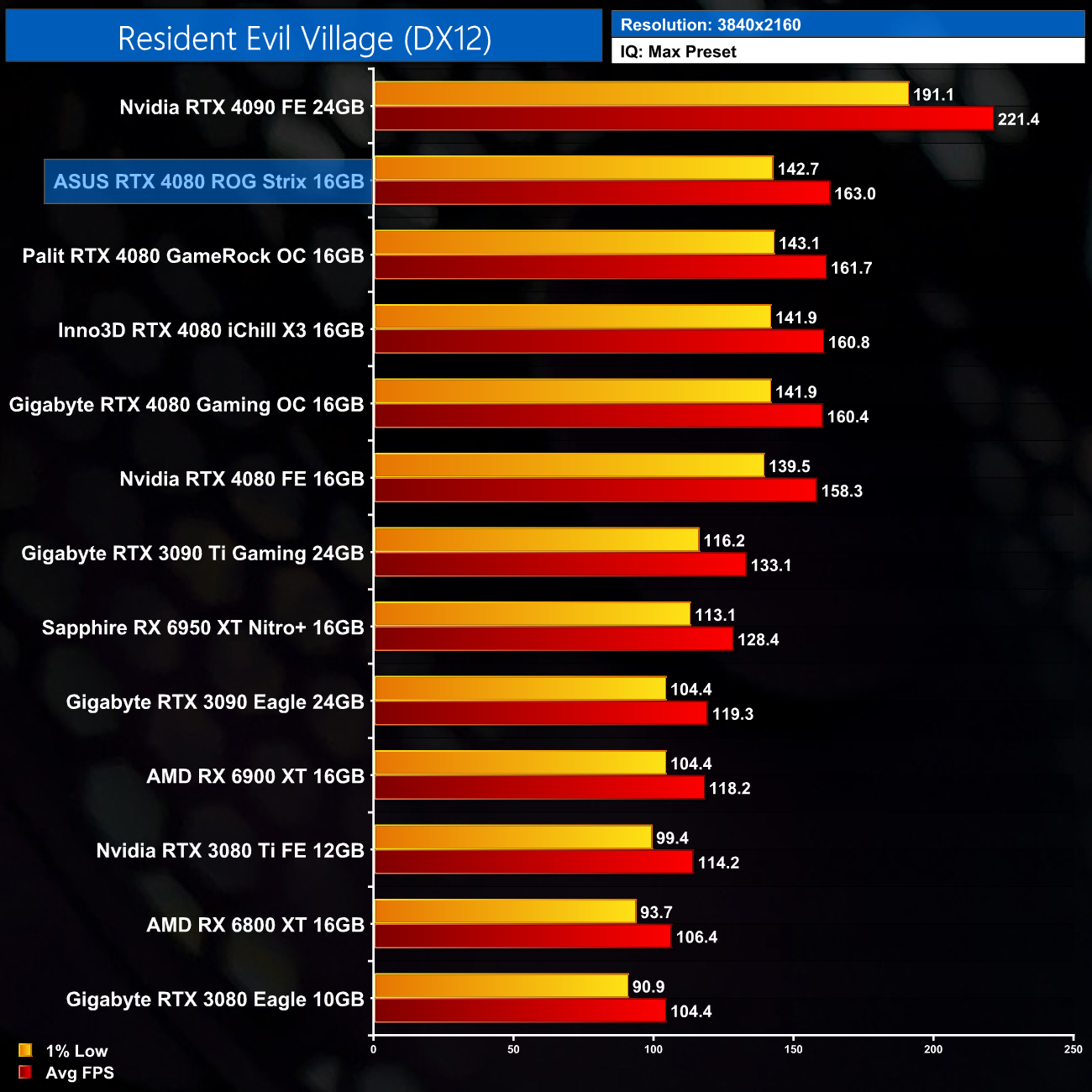 Over the five titles we tested, ASUS' ROG Strix RTX 4080 proves the fastest-running RTX 4080. Not always by much, as it ran 2-4% faster than Nvidia's Founders Edition, so we're talking a difference of 5FPS at most (in Resident Evil Village). We always say that a factory overclock should not be a key consideration when purchasing a new graphics card, as you are highly unlikely to be able to tell the difference when gaming.