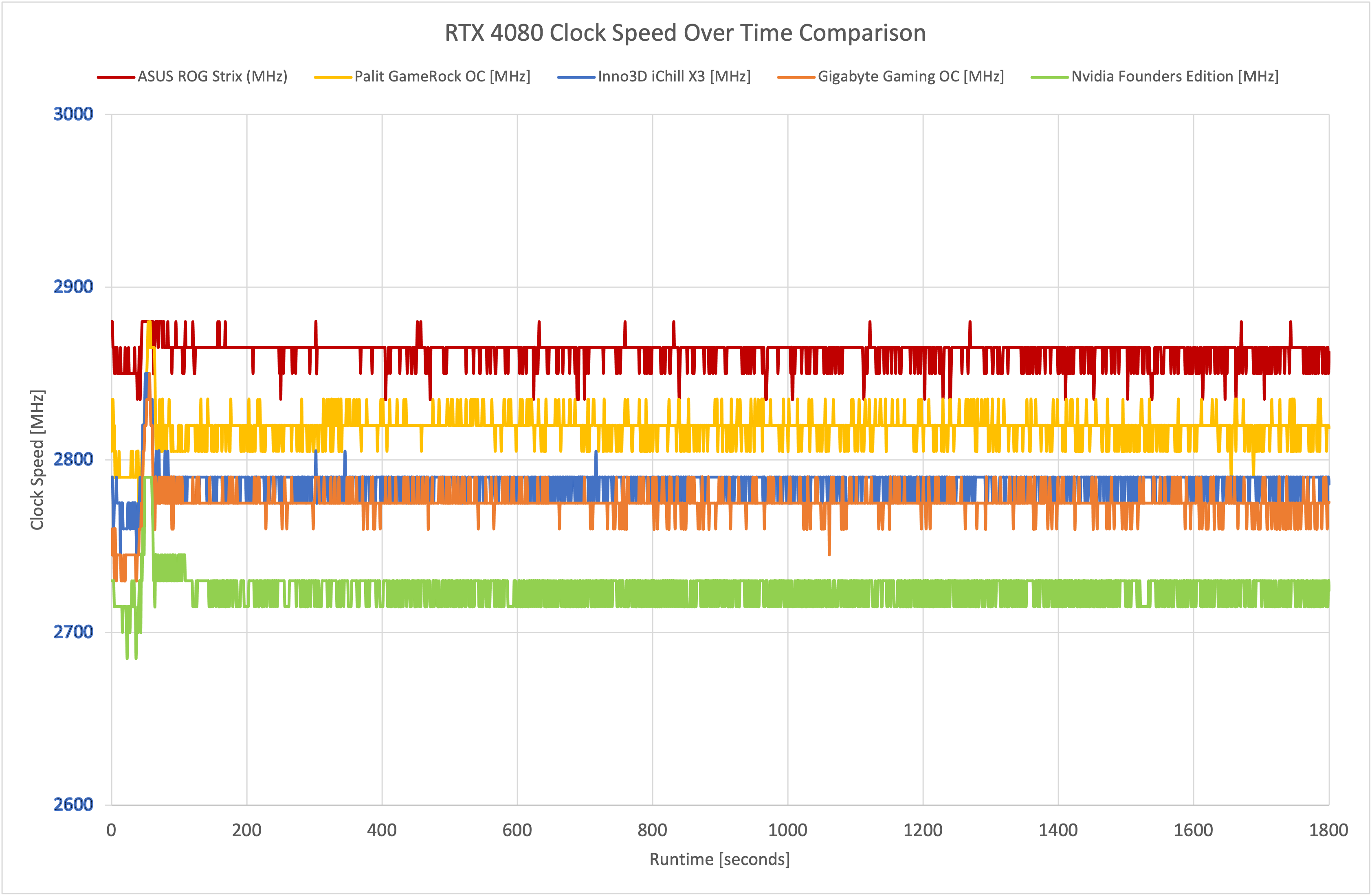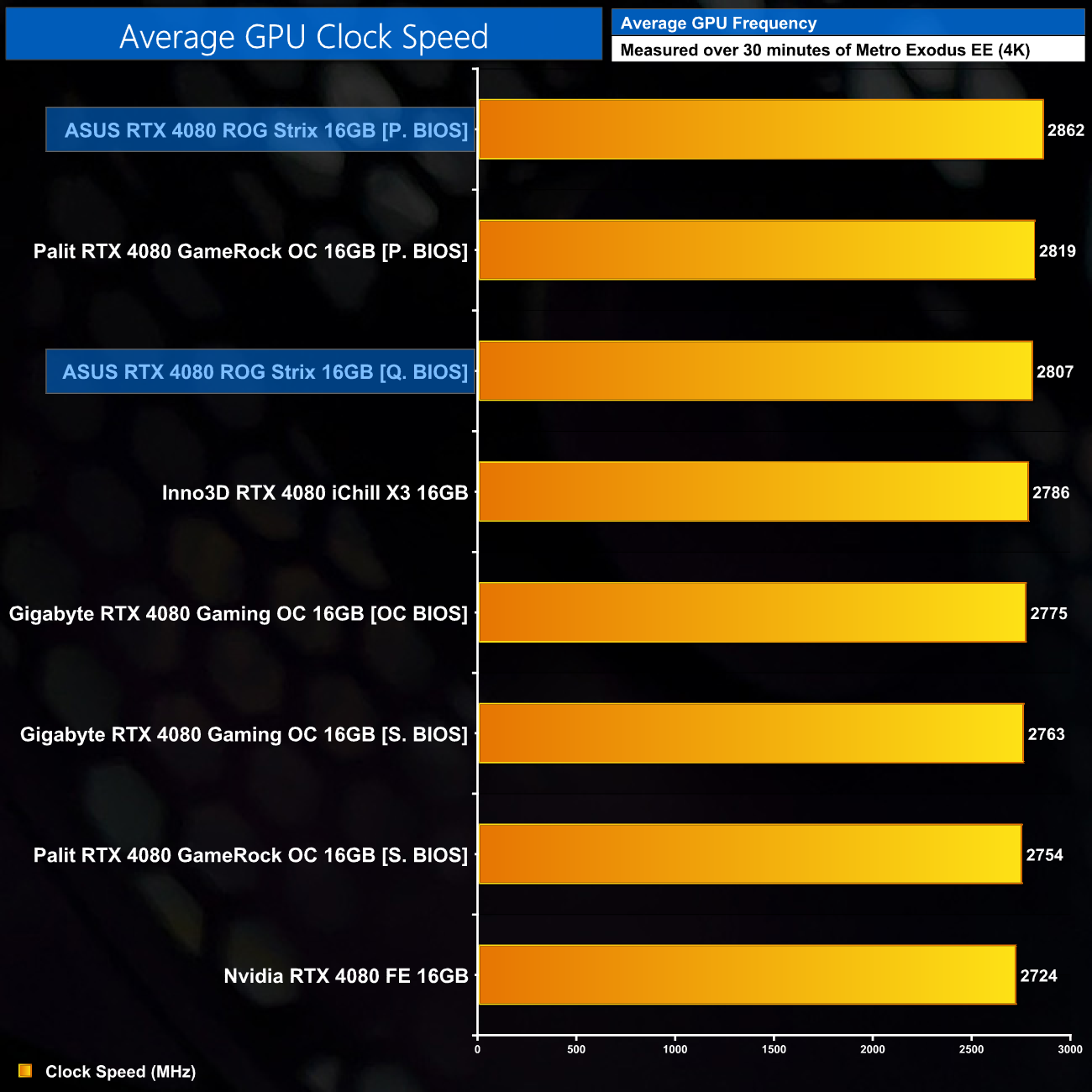 The reason the Strix proved to be the fastest-running RTX 4080 yet is as a result of its high operating clock speed. With a rated clock speed of 2625MHz, it boosted well over 2800MHz during our testing – in fact, averaged over our thirty minute stress test, it operated at 2862MHz. That's about 140MHz faster than the Founders Edition, and 40MHz faster than its next-closed rival, the Palit GameRock OC.