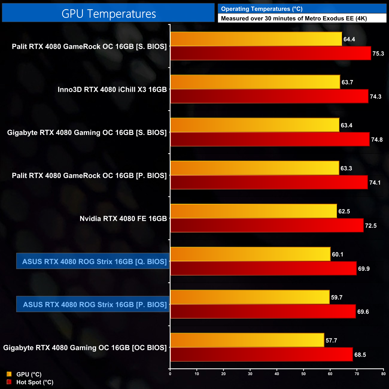 Thermals are an impressive area for the ROG Strix. Both BIOS modes saw the GPU operate around the 60C mark, with the hot spot hovering below 70C. Both are excellent results, and although not the outright best, do remember that these are out of the box results – in other words, they don't take fan speed (therefore noise levels) into account.