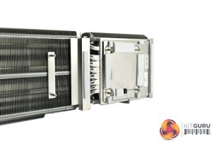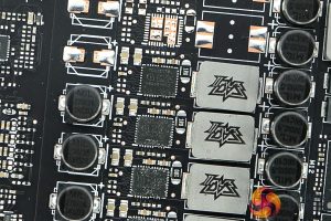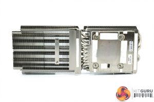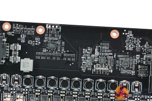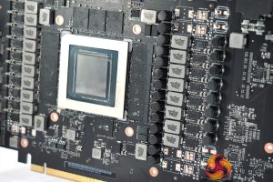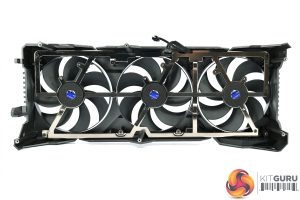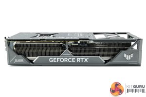 We can also get a look at the three 105mm Axial Tech fans. Due to the increased size of these, ASUS claims a 23% increase in airflow versus the previous generation. We can also note the central fan spins in reverse which should help to reduce airflow turbulence and therefore increase air pressure down into the heatsink.