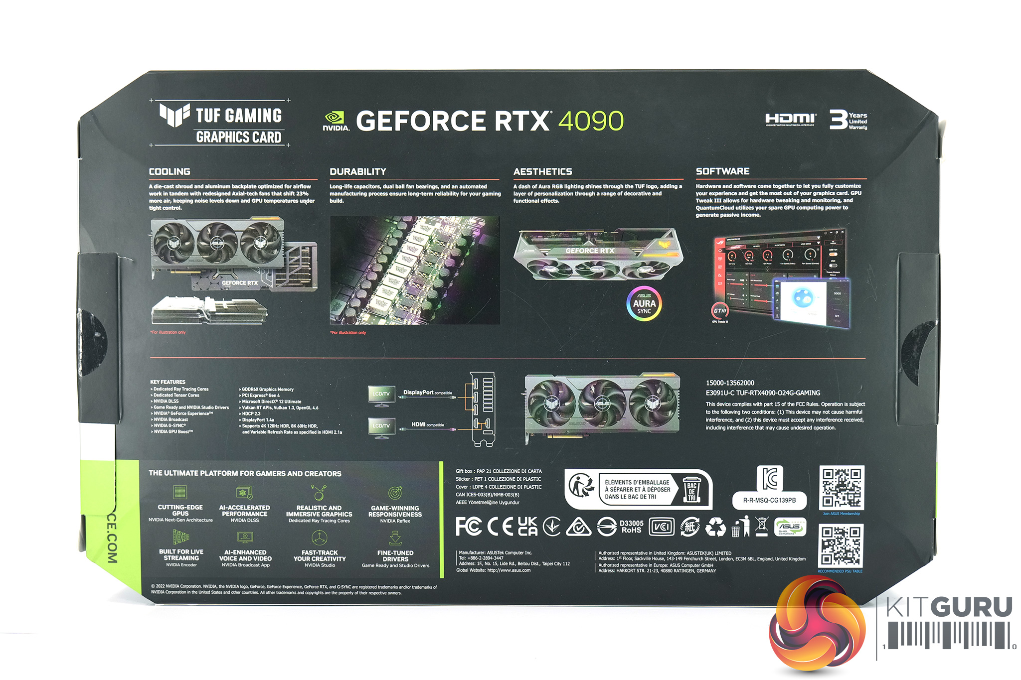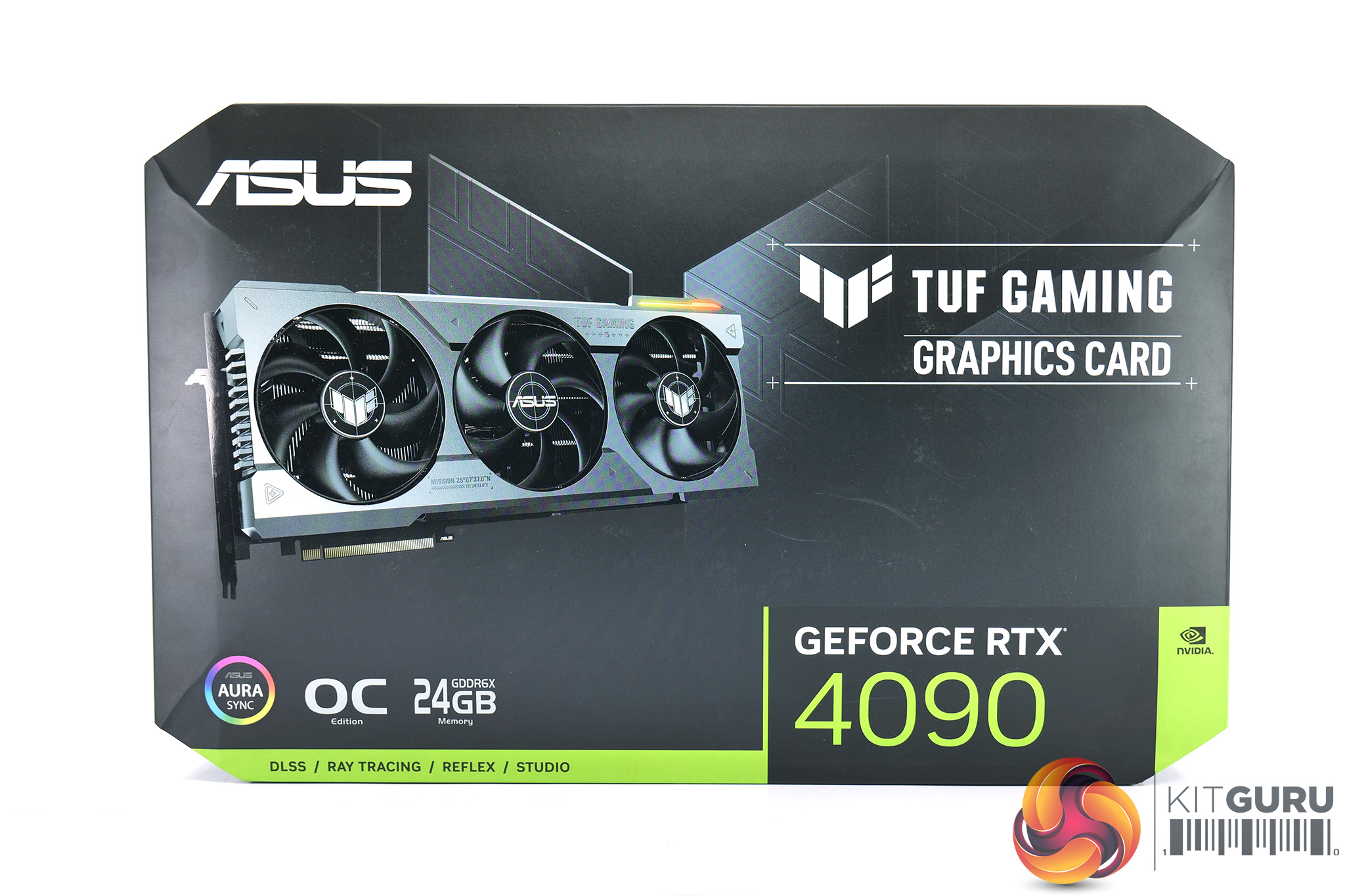 The ASUS RTX 4090 TUF Gaming OC ships in a black box, with product branding and an image of the card visible on the front. On the back, ASUS highlights various key features of the card and cooler.