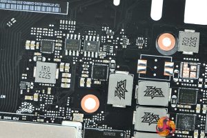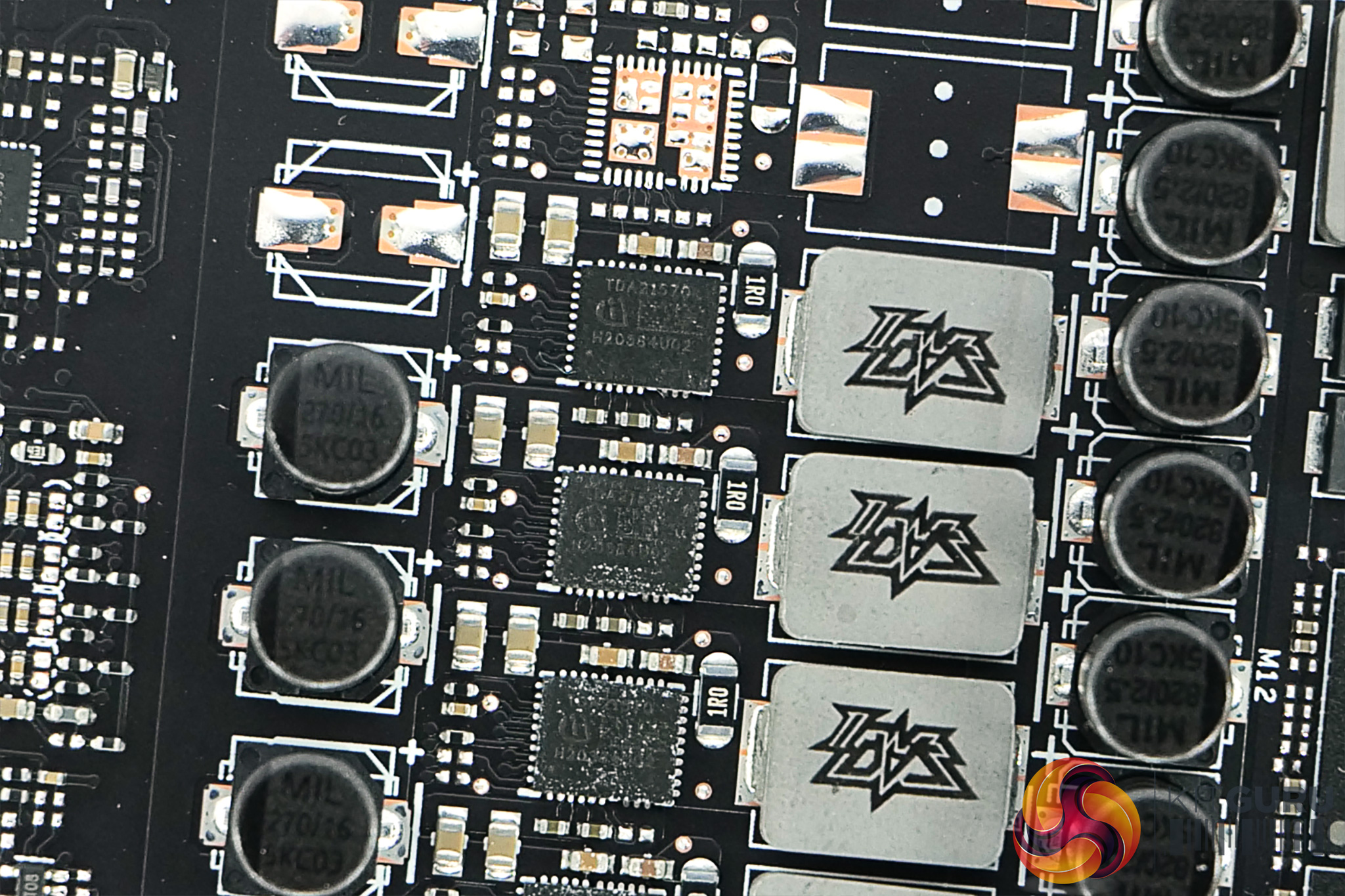 As for the PCB, we can see ASUS is using an 18-phase VRM for the GPU, using 70Amp Infineon TDA21570 MOSFETs, while the memory VRM is 4-phase, this time using 50A Vishay SIC639 MOSFETs. A Monolithic Power Systems MP2888A controller is used for the GPU VRM, with a UPI UP9512 controlling the memory VRM.