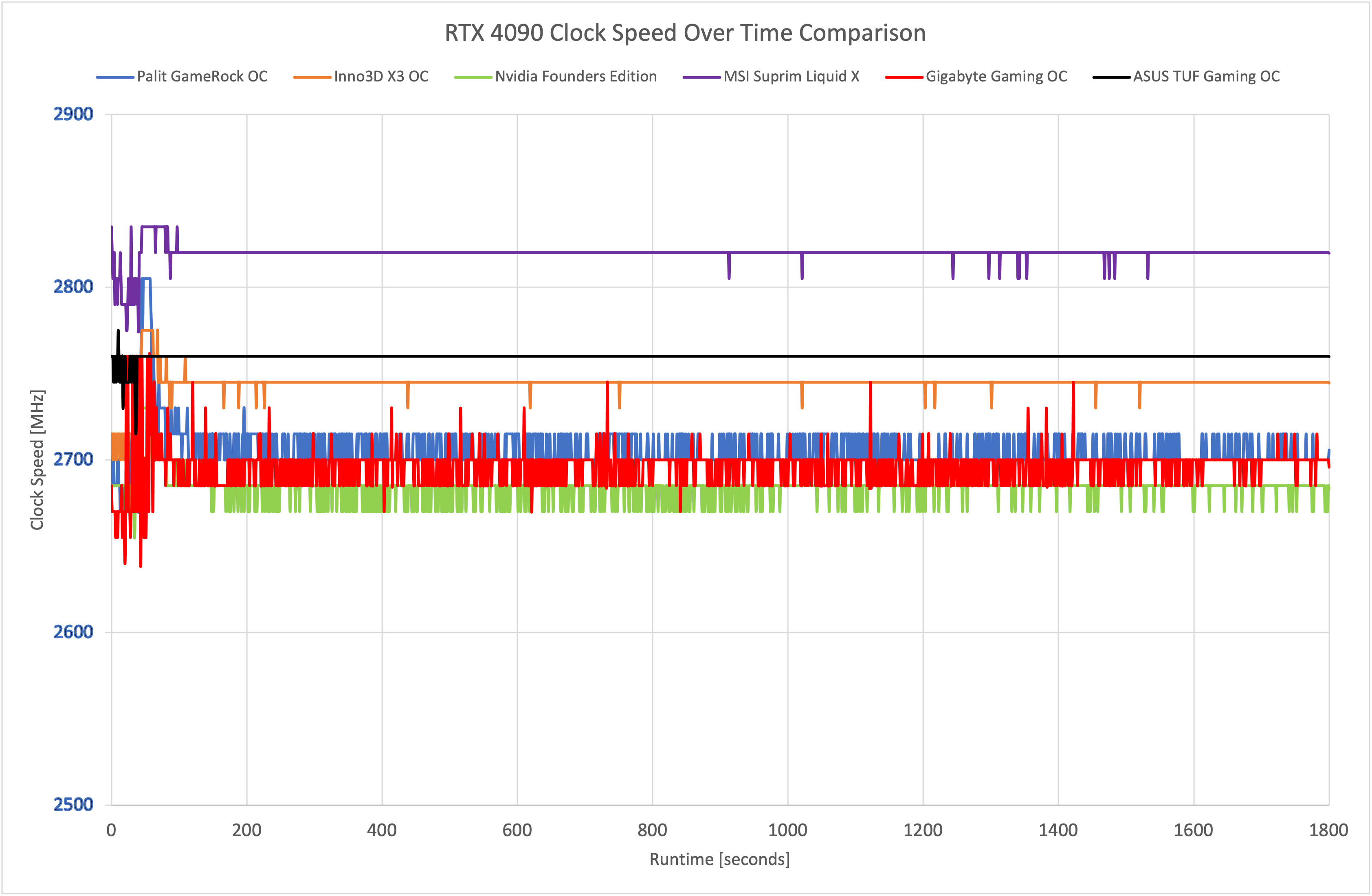 As you might have guessed from the game benchmarks, clock speed behaviour is very similar to the other RTX 4090s we have tested, with the TUF Gaming OC's Performance BIOS averaging 2760MHz over our 30-minute stress test, while the Quiet BIOS averaged 2738MHz due to its higher operating temperatures which affects the GPU Boost algorithm.