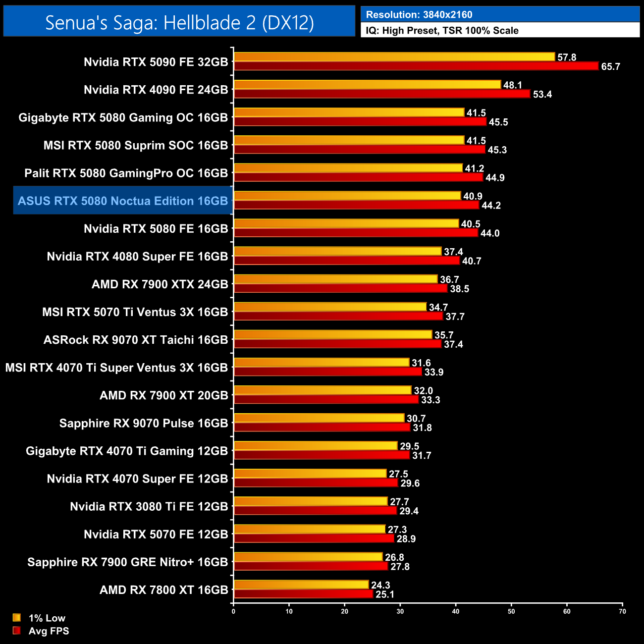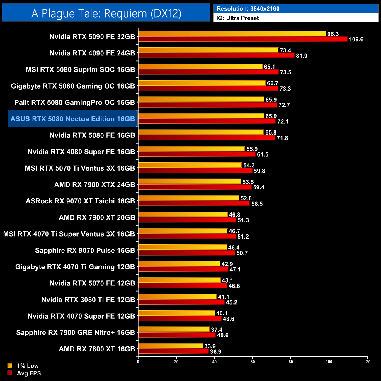We don't focus too heavily on game benchmarks in our partner cards reviews as performance doesn't tend to change a whole lot when compared to the reference models. That said, it was interesting to see the Noctua Edition lagging slightly behind the other 5080 AIBs we've tested – not by much, and it was always faster than the 5080 FE, but it didn't surpass the likes of the MSI Suprim SOC or the Gigabyte Gaming OC.