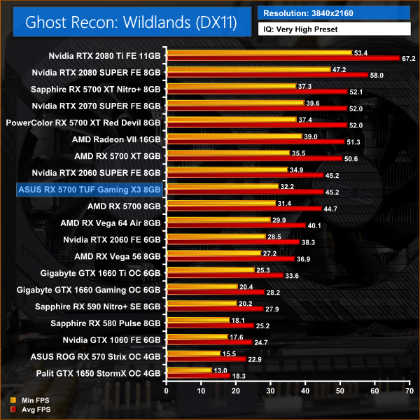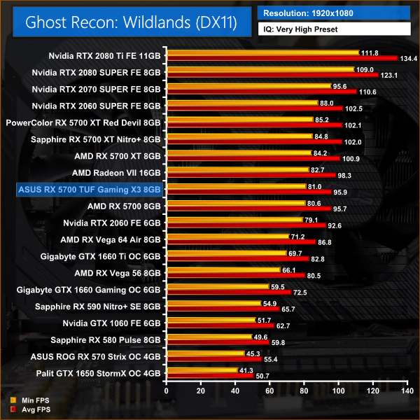 Ghost Recon Wildlands shows some of the smallest differences between ASUS' factory overclocked card, and the stock-clocked reference design. At 1080p and 1440p, there's less than a single percentage point in it.