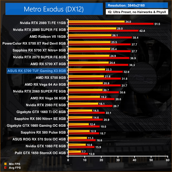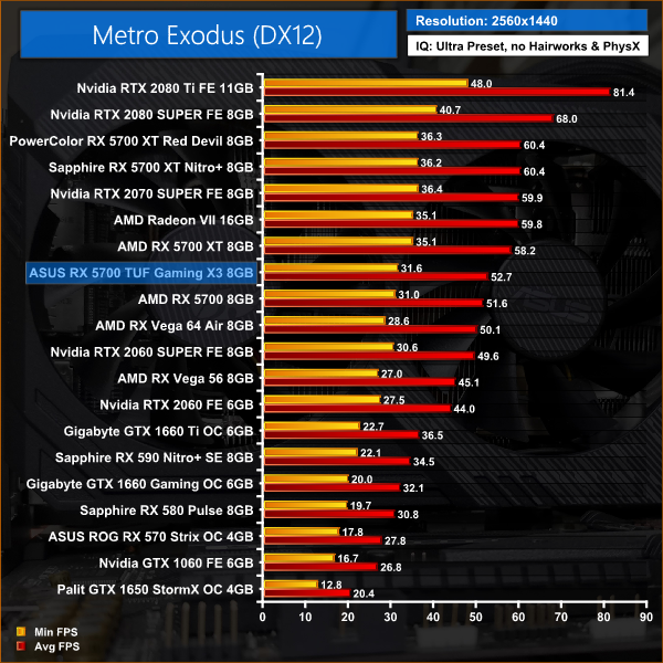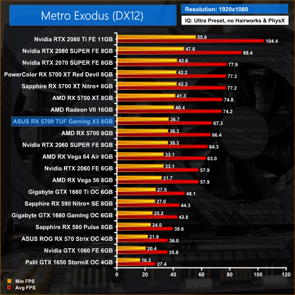 Metro Exodus is, perhaps surprisingly considering it was one of the first games with RTX support, another title which has RX 5700 a fair margin ahead of 2060 SUPER, with this ASUS card proving 6% faster at 1440p. The TUF Gaming X3 is 2% faster than the reference 5700 here.