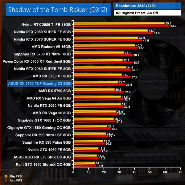 Despite again falling behind 2060 SUPER in Shadow of the Tomb Raider, it's another 2% win for the TUF Gaming card when compared to the reference 5700.