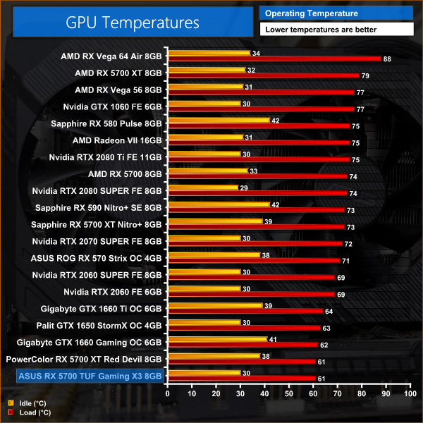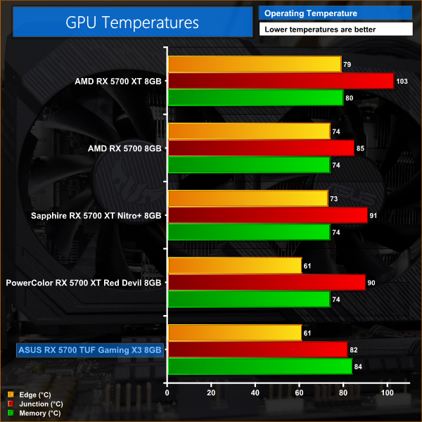 As you can see, the TUF Gaming X3's memory peaked a whole 10C hotter than the reference RX 5700. We mentioned at the start of this review how the lack of any kind of VRAM cooling was surprising, and it certainly shows based on this testing.