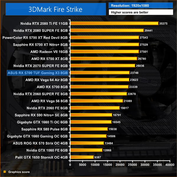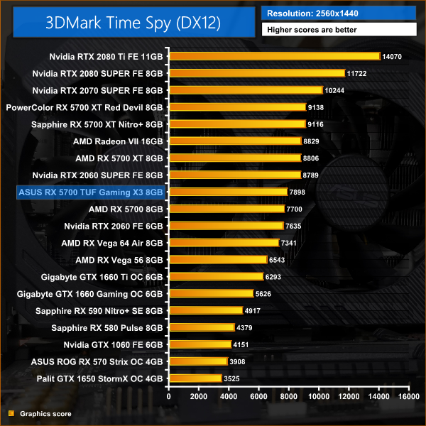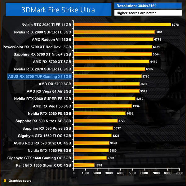 With a 95MHz clock speed advantage over the reference RX 5700, 3DMark translates this into 2 or 3% gains for the ASUS TUF Gaming card – 2% for Fire Strike, and 3% with Time Spy and Fire Strike Ultra.
