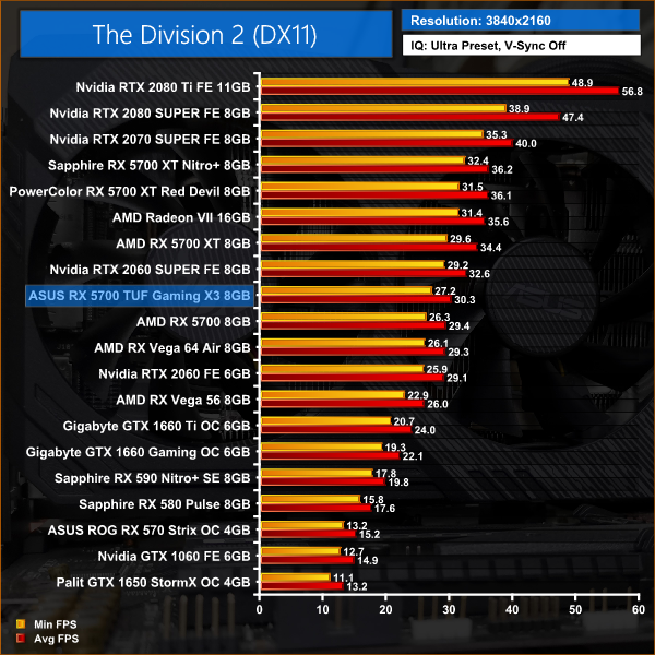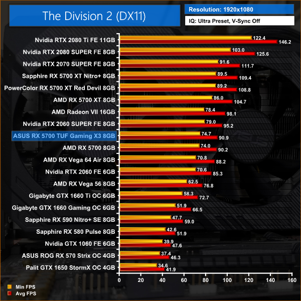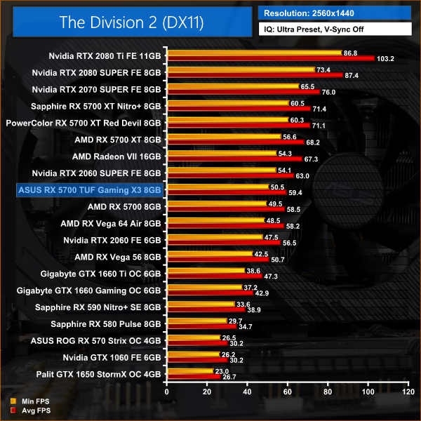 Things carry on in a similar vein with The Division 2, a new addition to our roster. Here, the TUF Gaming card proves 2% faster than reference at 1440p, which works out at less than a single frame.