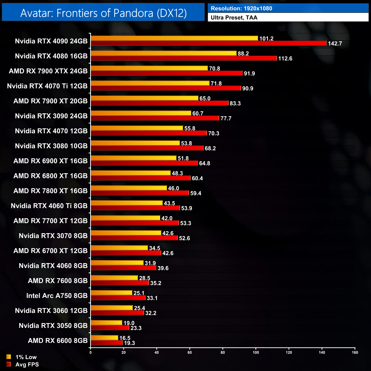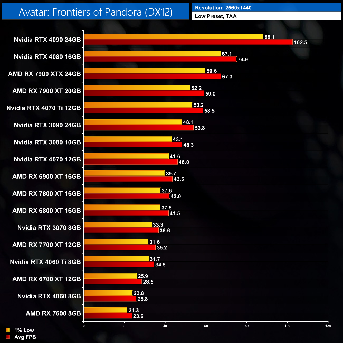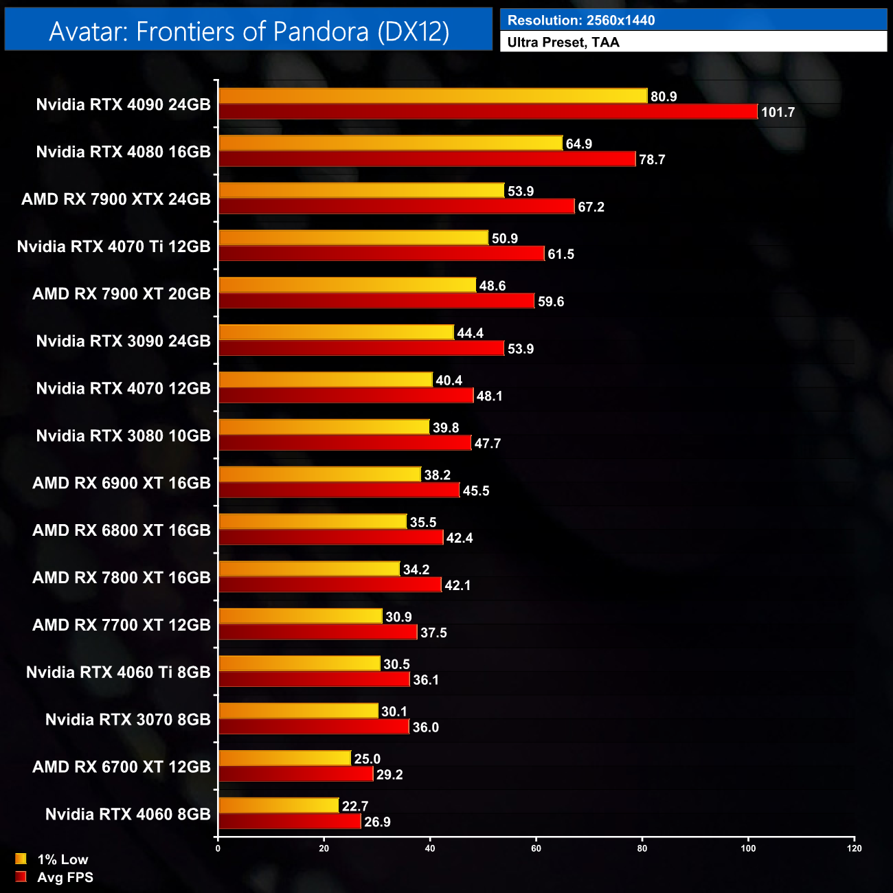 The other main trend I noticed is how much stronger Nvidia’s offerings perform compared to AMD. Across the board, Nvidia was winning all the key match ups – with the RTX 4080 ahead of the 7900 XTX, the 4070 was beating the 7800 XT comfortably, and the 4060 was faster than the 7600. It would seem the game’s heavy integration of ray tracing features is likely the reason for this, though it does make me wonder why AMD sponsored Avatar in the first place, considering their GPUs don’t look like the best way to play, but it is what it is.