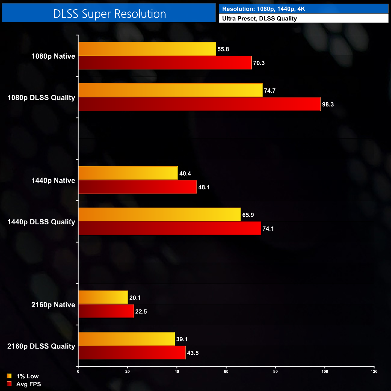 We go over a brief image quality analysis in the video, but using the Quality mode for both DLSS and FSR results in very similar performance scaling, with the gains being biggest at 4K, where performance almost doubles thanks to the lower internal resolution.
