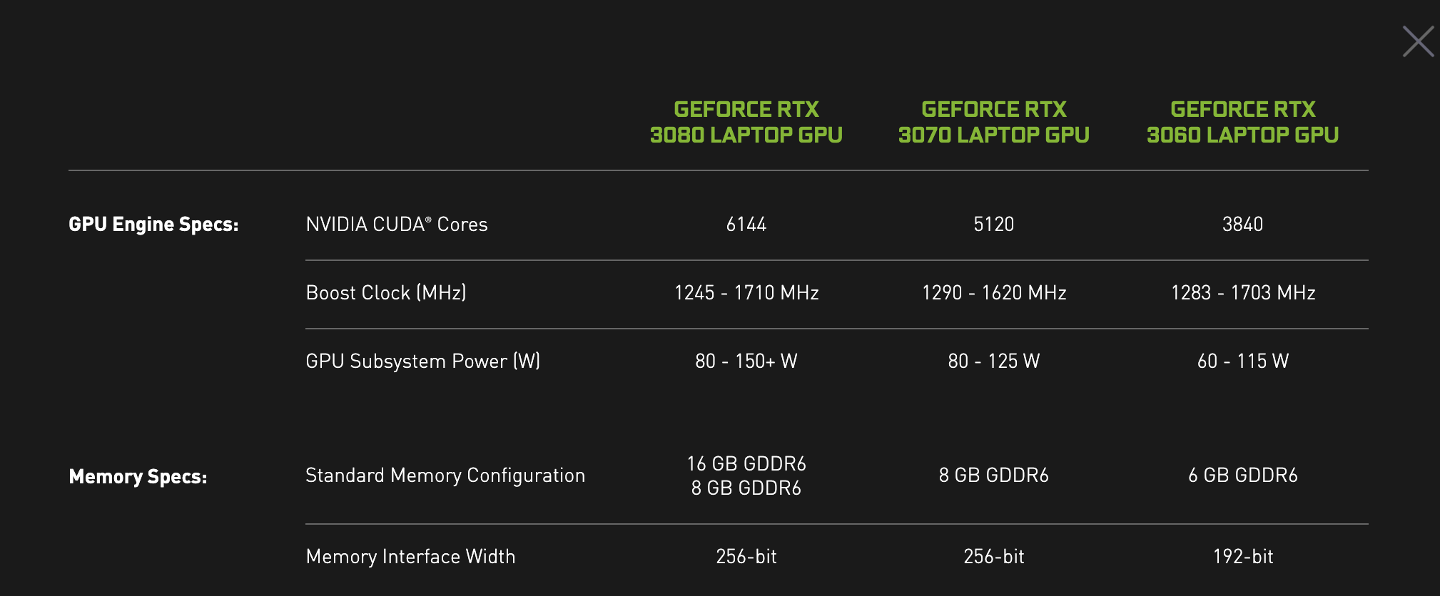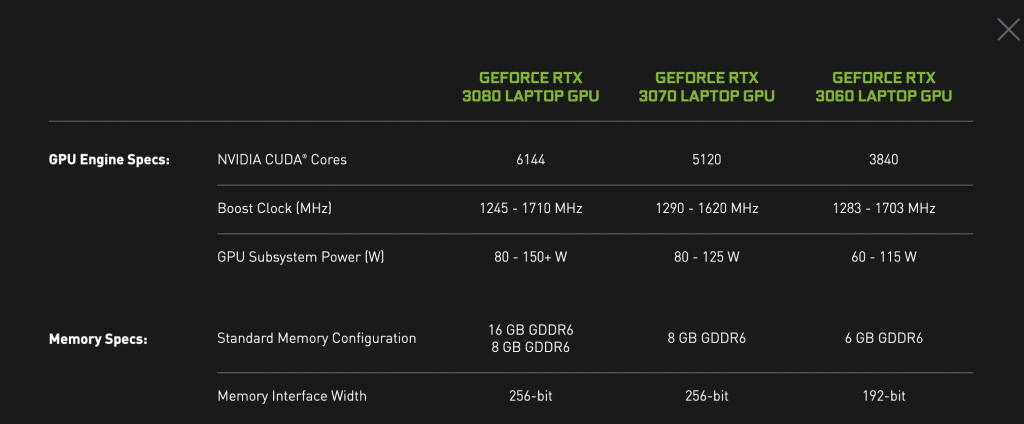 One key change with these Ampere GPUs is that core counts do not match up with their desktop equivalents – or the RTX 3080 would have over 8700 cores instead of 6144. This is likely due to power management, as that many cores in a portable machine would be unfeasible due to thermal concerns.