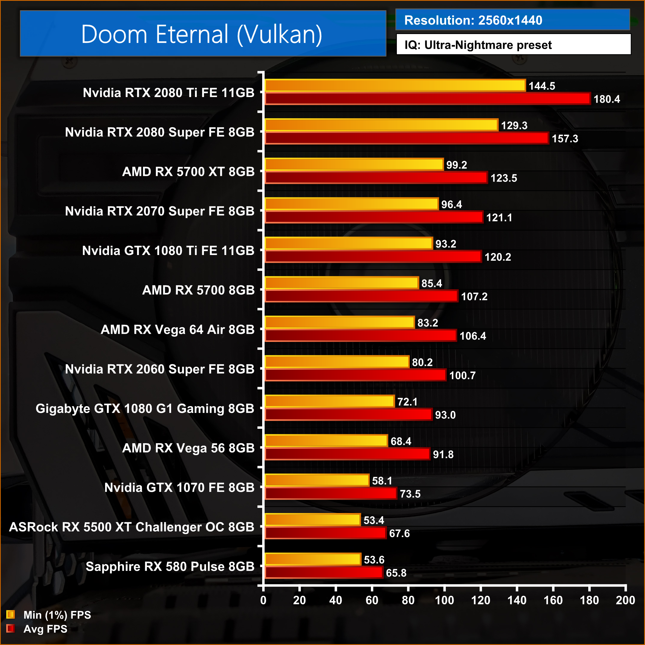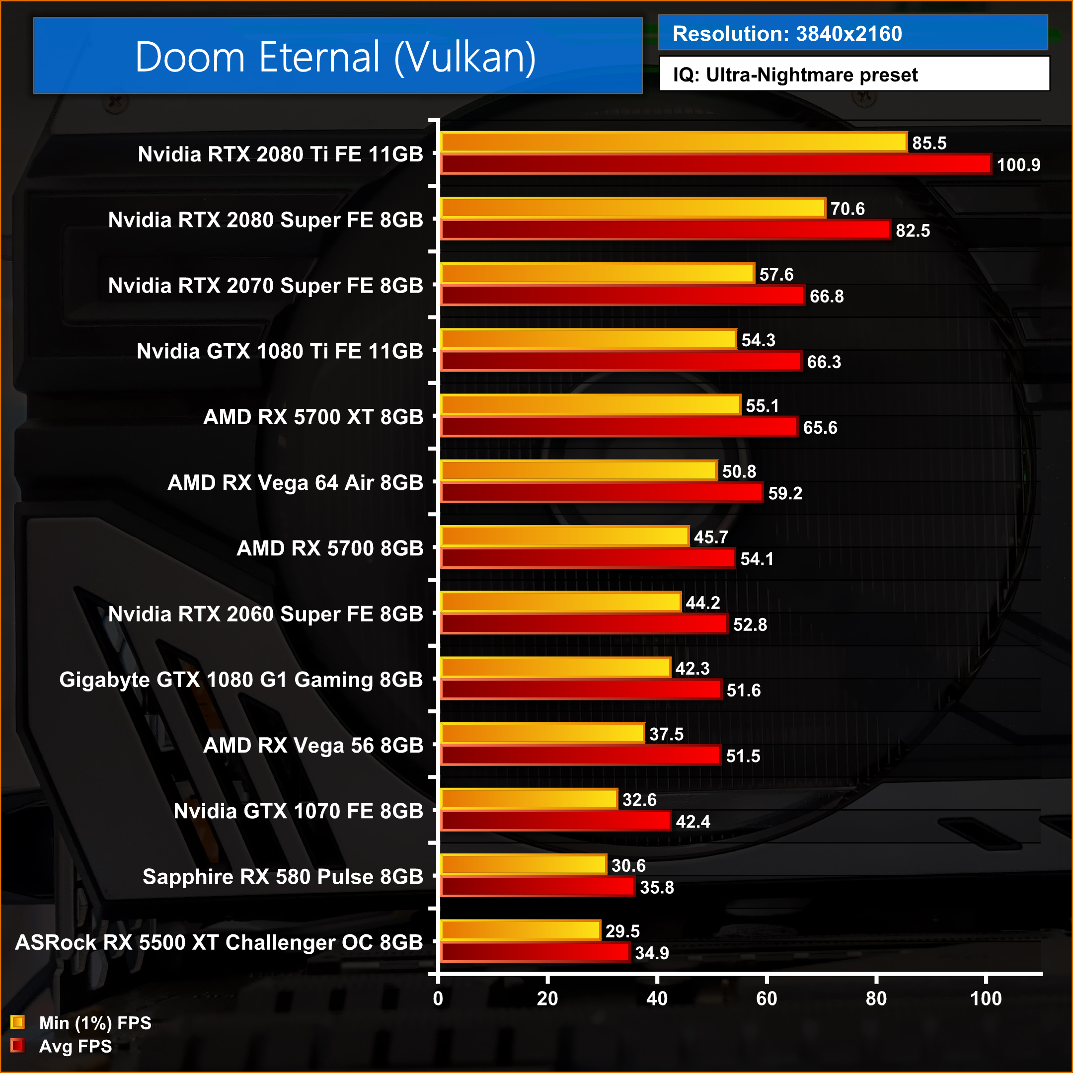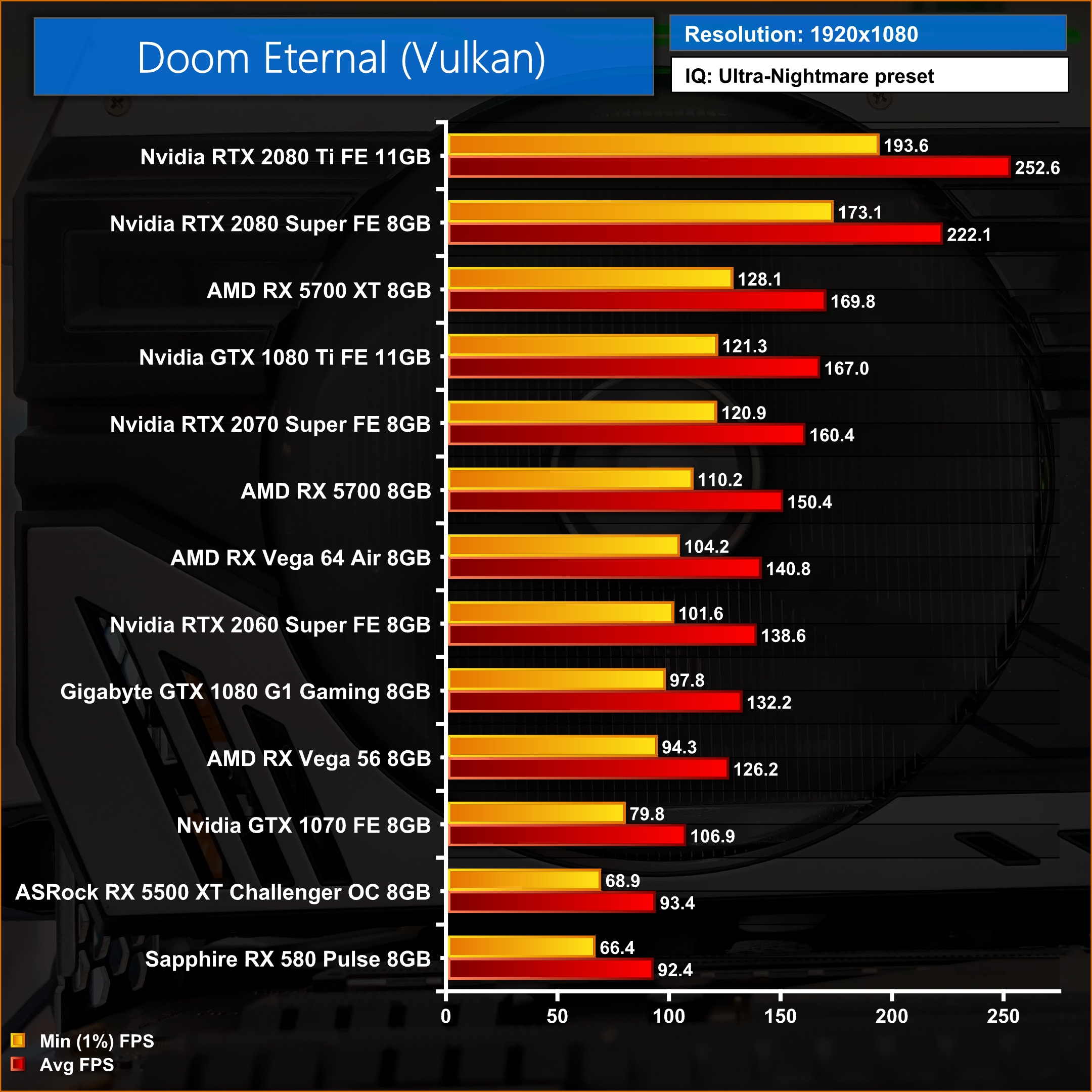 In a nutshell, I think it is crystal clear Doom Eternal runs very, very well on a wide variety of hardware. Gamers with high-end rigs using RTX 2080 Super or RTX 2080 Tis are set for even high-refresh rate 4K gaming, while cards like the RX 5700 XT and RTX 2070 Super can still push over 60fps at 4K, using Ultra Nightmare settings. More mid-range cards like the GTX 1660 and RX 5600 XT are still very ready for Ultra settings at 1440p, and even the GTX 1650 non-Super offers a smooth 1080p experience with High settings.