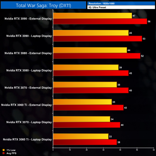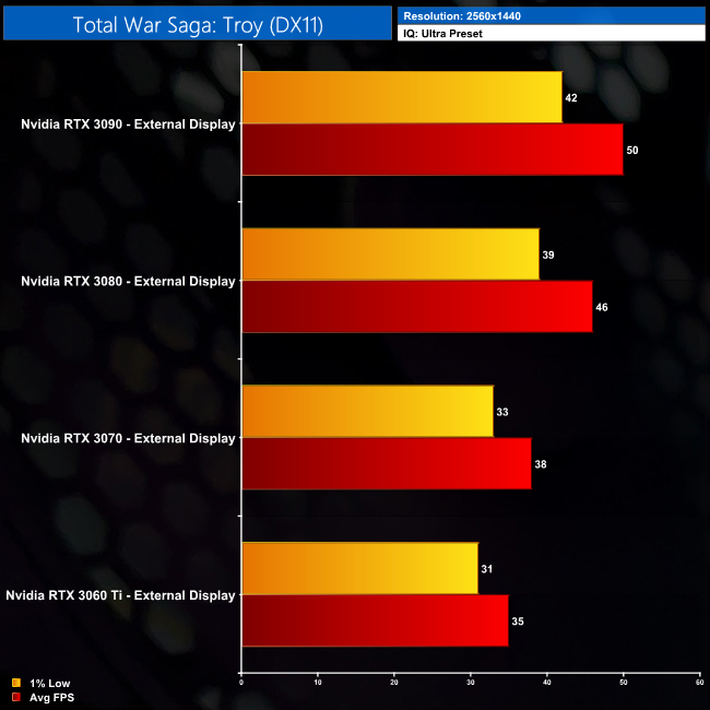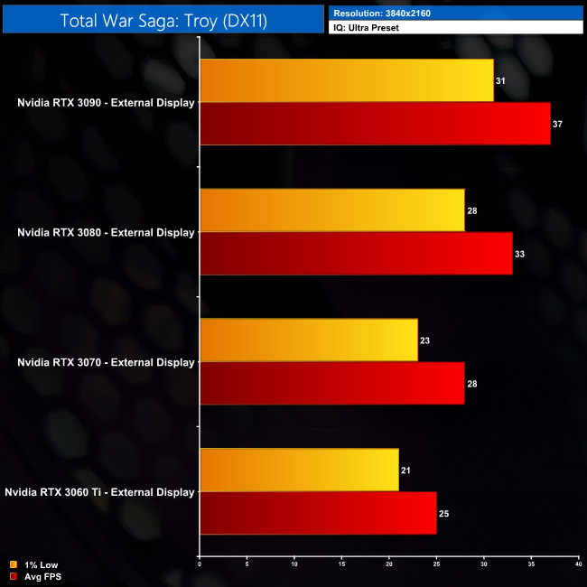 Next is Total War Saga: Troy. This is one of the better examples of eGPU performance scaling, with results in line with Gears 5 and Metro Exodus. We see that from the RTX 3090 out-performing the RTX 3080 by 12% at 4K, while the RTX 3080 is 21% faster than the RTX 3070 at 1440p.