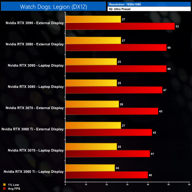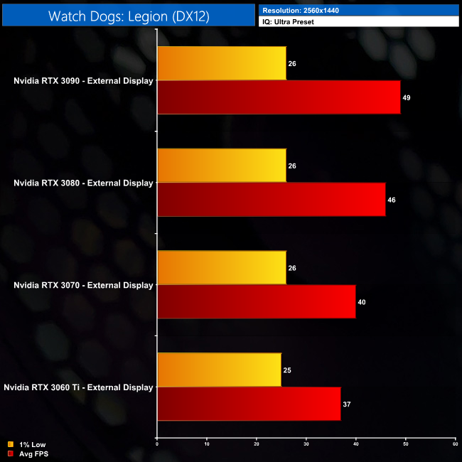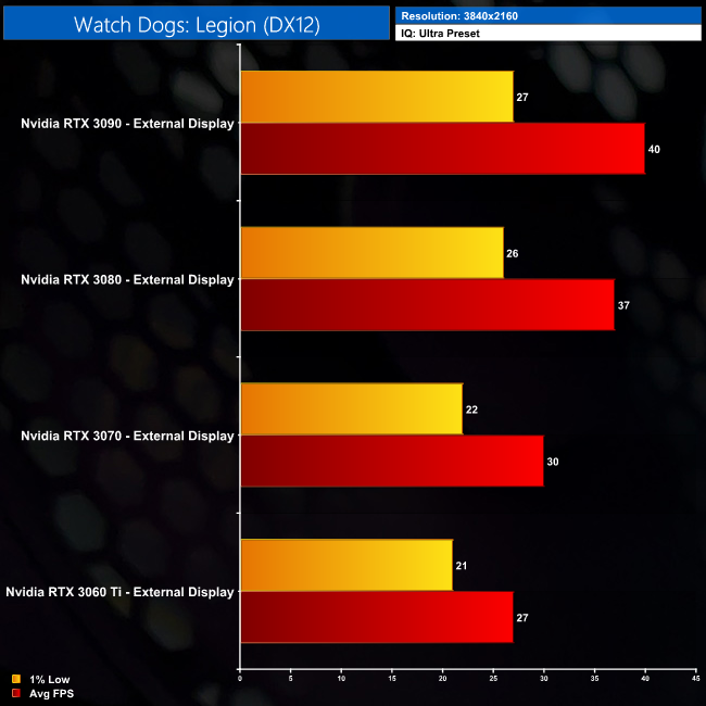 At 1440p for instance, the RTX 3080 is 15% faster than the RTX 3070 when looking at average frame rates, but both produce identical 1% low performance, hitting just 26FPS. It’s the same at 4K too – average frame rates look OK, but we are let down by the 1% lows here. Whether or not this is a CPU limitation or whether it is down to the PCIe bandwidth, it’s harder to say for Watch Dogs, but it is definitely something to bear in mind if you are considering an eGPU.