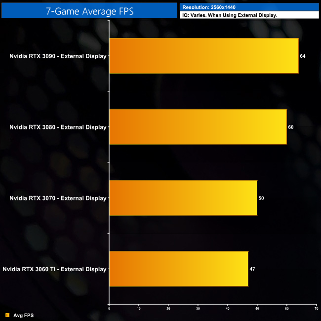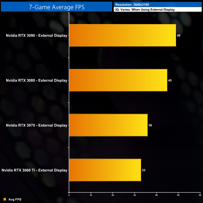Grouping both 1080p charts together, if for whatever reason you cannot use an eGPU with an external monitor, a decent level of performance is still on offer from the four GPUs tested. However, we can clearly see little benefit to the using the RTX 3070 over a RTX 3060 Ti, and I’d say the same for the RTX 3090 instead of an RTX 3080 – Nvidia's flagship GPU is 7% faster, but that’s just a difference of 4FPS on average.
