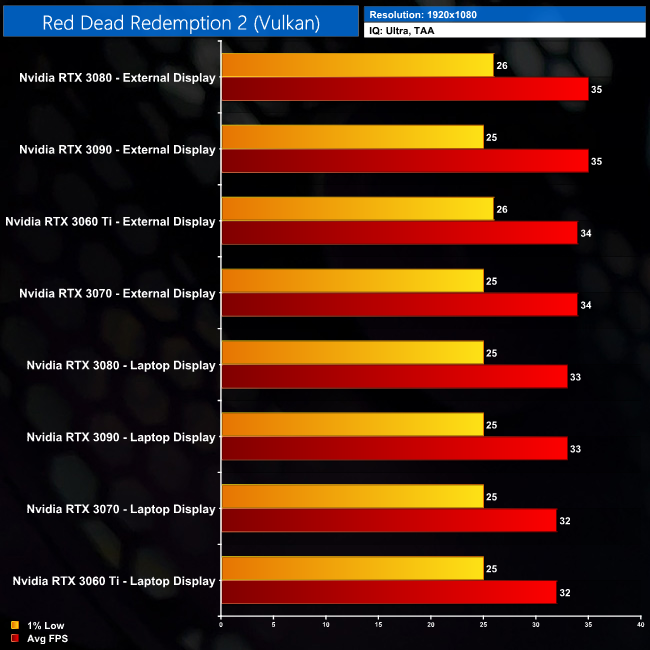 As for Red Dead Redemption 2, here we are clearly being bottlenecked using an eGPU. At 1080p, performance varies by just 3FPS regardless of the GPU used… though it is interesting that all four of the slowest results came when using the laptop’s integrated screen, as opposed to using an external monitor.