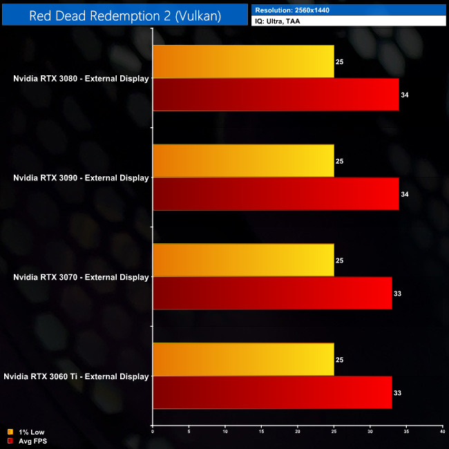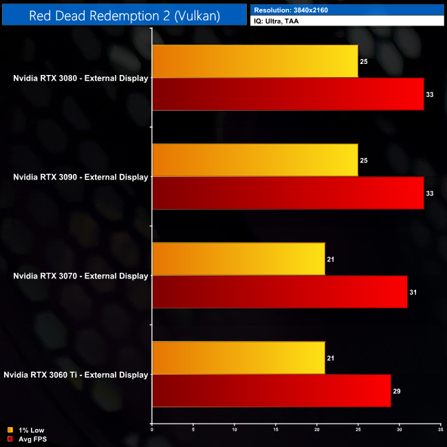 Even at 1440p, the results are basically the same, with the RTX3080 and RTX 3090 delivering just a single frame more when compared to the RTX 3060 Ti and RTX 3070. At 4K, there is a slightly larger gap, but we’re still only talking about a 4FPS difference between an RTX 3060 Ti and an RTX 3090. Considering this is happening at 4K, where we'd expect to be entirely GPU-limited, we would have to say that PCIe bandwidth is causing these issues in Red Dead Redemption 2.