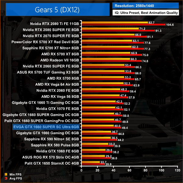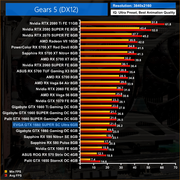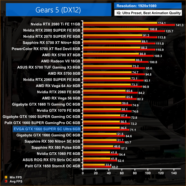 As for Gears 5, here the EVGA SC Ultra is 5% slower than the GTX 1660 Ti, while it also sits just behind the other two GTX 1660 SUPER cards on our chart.