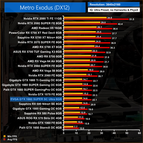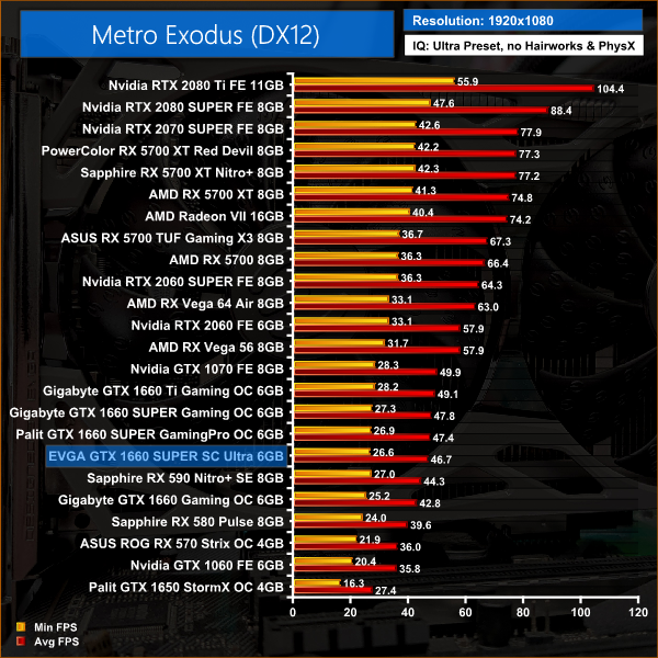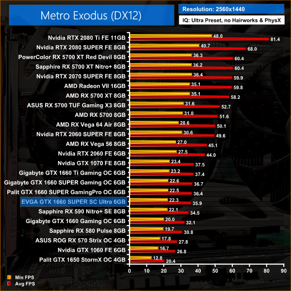 It's more of the same when we get to Metro Exodus, with another 2% gap between our 1660 SUPER cards. This EVGA SC Ultra is 4% slower than GTX 1660 Ti.