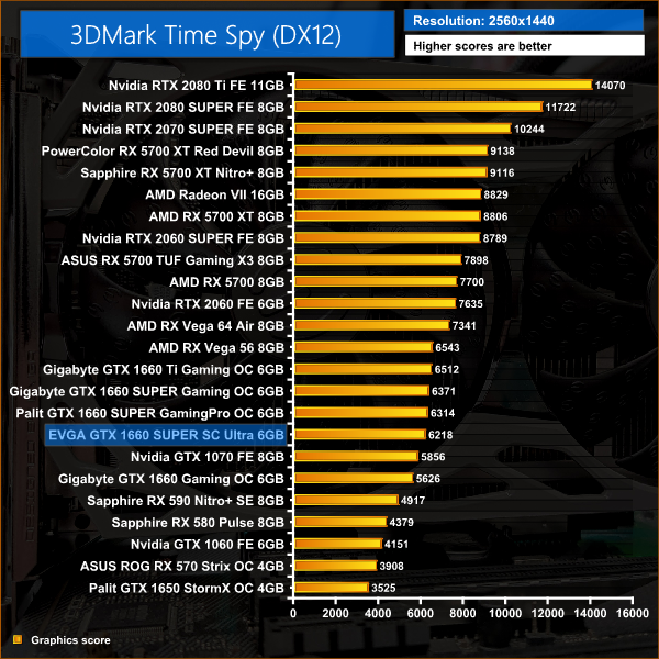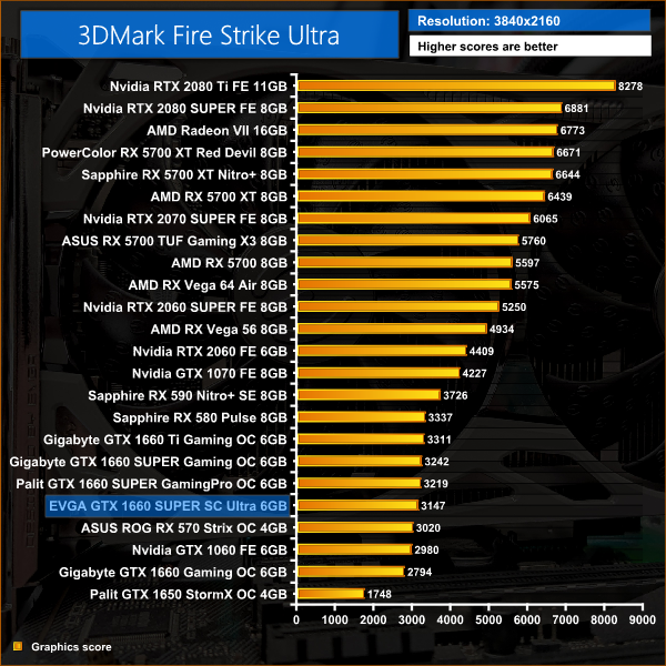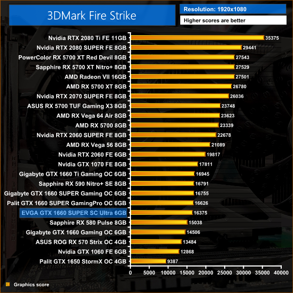 Initial 3DMark results have the EVGA SC Ultra scoring the lowest of our three 1660 SUPER cards. There's not much in it, but the EVGA is 3% slower than the Gigabyte Gaming OC 6G model here.