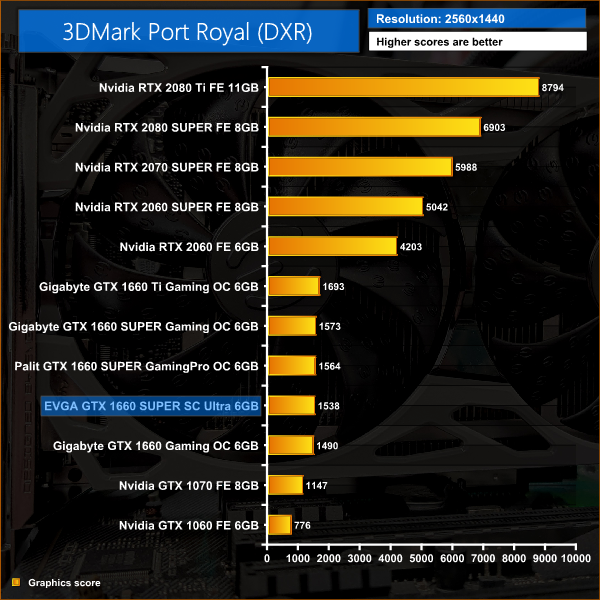 Port Royal continues the initial trend from 3DMark Fire Strike, with the SC Ultra scoring 45 points less than the Gigabyte 1660 SUPER.