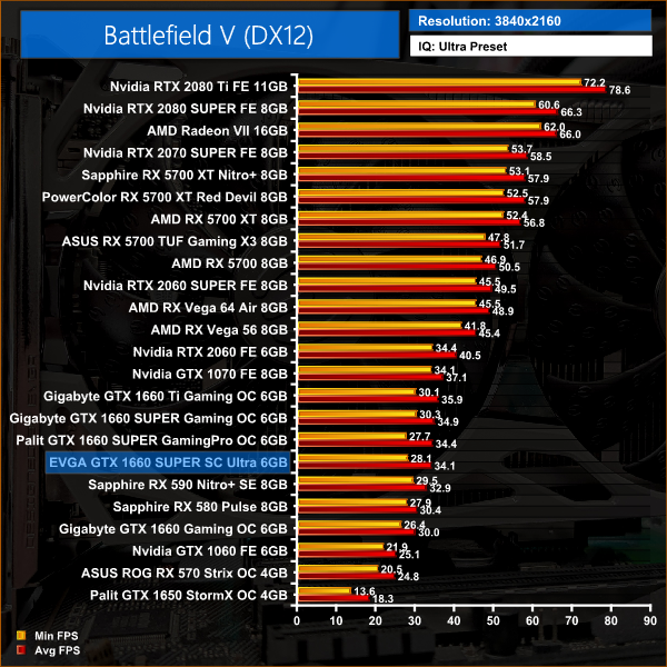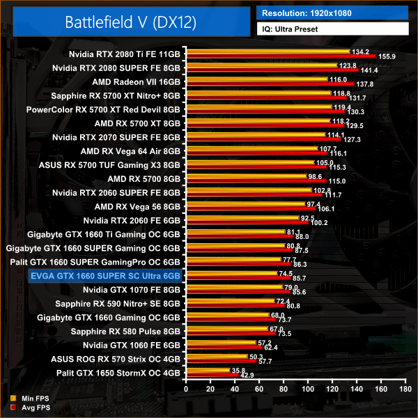 In Battlefield V, all three 1660 SUPER cards perform within 2% of each other, though it is the EVGA SC Ultra coming bottom of the three.
